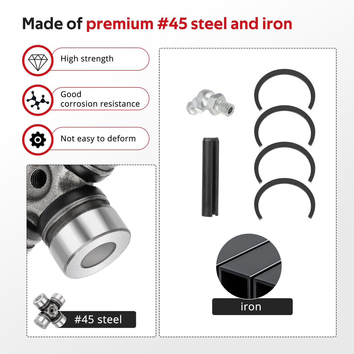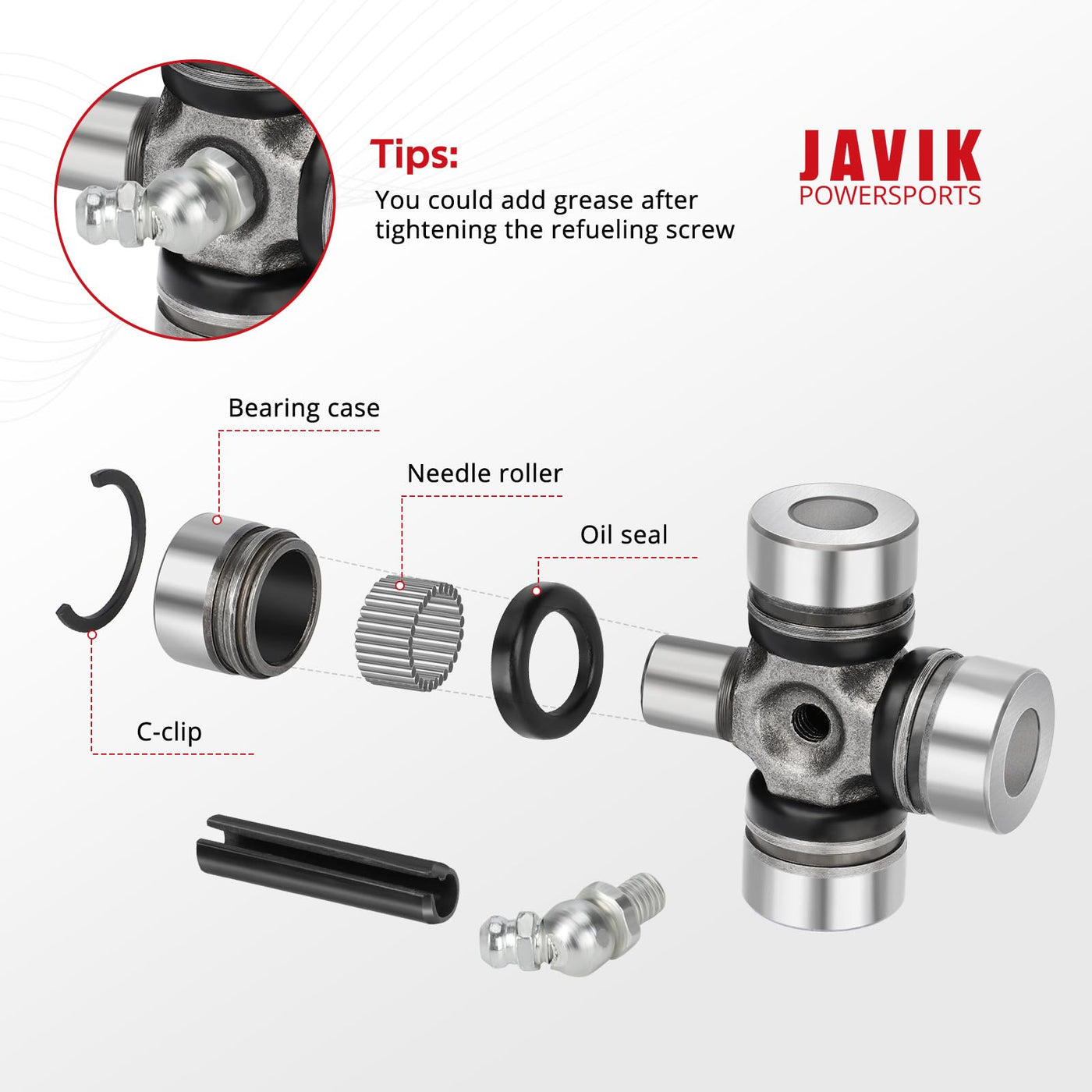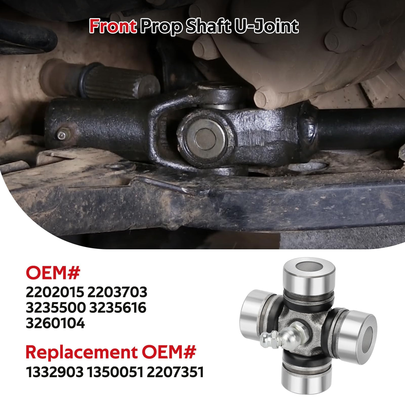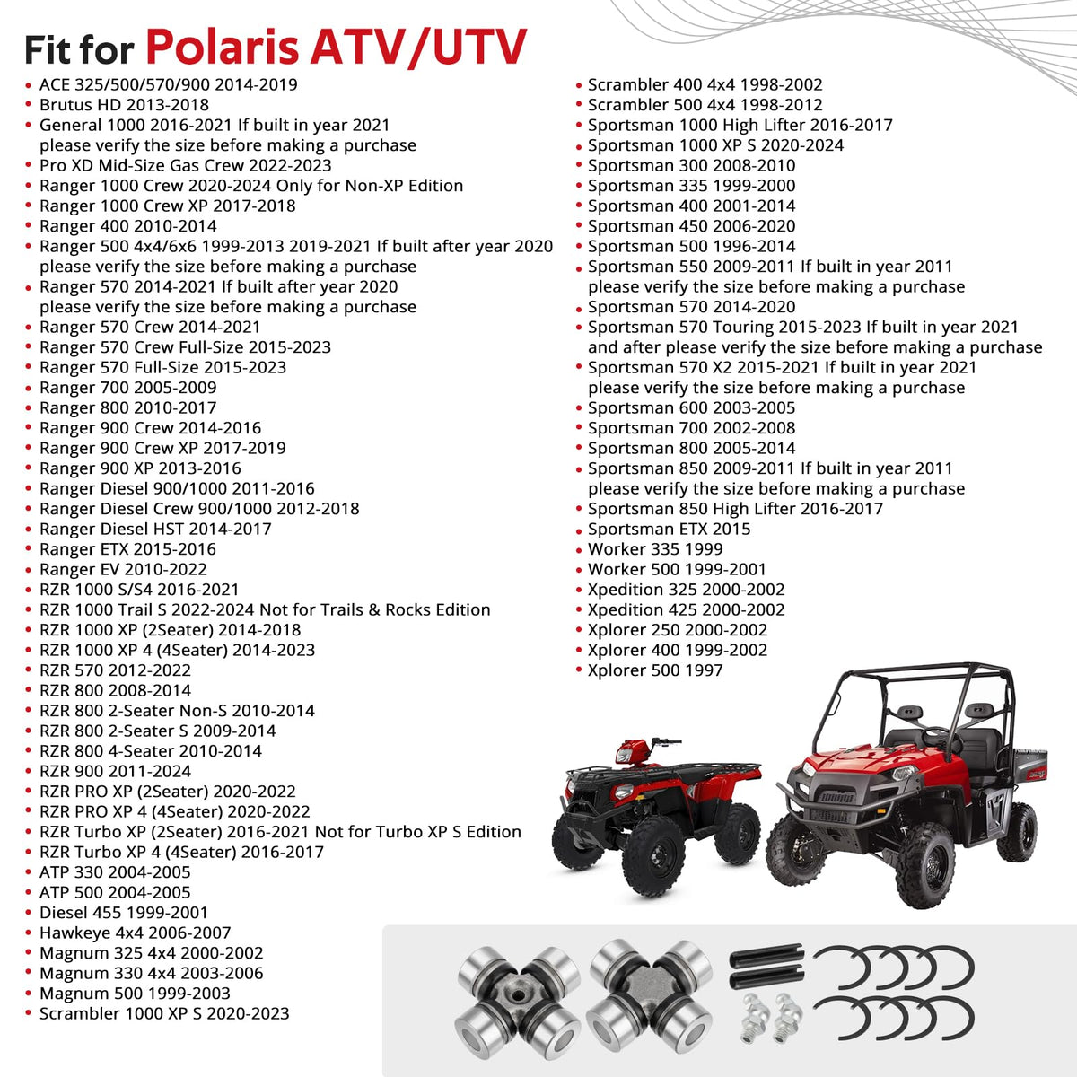 OEM# 2202015 2203703 3235500 3235616 3260104 Replacement OEM# 1332903 1350051 2207351 Package: U-Joint x 2 C-clip x 8 Fitting-Lubrication x 2 Pin x 2 Fit for Polaris ATV/UTV ACE 325/500/570/900 2014-2019 Brutus HD 2013-2018 General 1000 2016-2021 If built in year 2021 please verify the size before making a purchase Pro XD Mid-Size Gas Crew 2022-2023 Ranger 1000 Crew 2020-2024 Only for Non-XP Edition Ranger 1000 Crew XP 2017-2018 Ranger 400 2010-2014 Ranger 500 4x4/6x6 1999-2013 2019-2021 If built after year 2020 please verify the size before making a purchase Ranger 570 2014-2021 If built after year 2020 please verify the size before making a purchase Ranger 570 Crew 2014-2021 Ranger 570 Crew Full-Size 2015-2023 Ranger 570 Full-Size 2015-2023 Ranger 700 2005-2009 Ranger 800 2010-2017 Ranger 900 Crew 2014-2016 Ranger 900 Crew XP 2017-2019 Ranger 900 XP 2013-2016 Ranger Diesel 900/1000 2011-2016 Ranger Diesel Crew 900/1000 2012-2018 Ranger Diesel HST 2014-2017 Ranger ETX 2015-2016 Ranger EV 2010-2022 RZR 1000 S/S4 2016-2021 RZR 1000 Trail S 2022-2024 Not for Trails & Rocks Edition RZR 1000 XP (2Seater) 2014-2018 RZR 1000 XP 4 (4Seater) 2014-2023 RZR 570 2012-2022 RZR 800 2-Seater Non-S 2010-2014 RZR 800 2-Seater S 2009-2014 RZR 800 4-Seater 2010-2014 RZR 900 2011-2024 RZR PRO XP (2Seater) 2020-2022 RZR PRO XP 4 (4Seater) 2020-2022 RZR RS1 2018-2022 RZR Turbo XP (2Seater) 2016-2021 Not for Turbo XP S Edition RZR Turbo XP 4 (4Seater) 2016-2017 ATP 330 2004-2005 ATP 500 2004-2005 Diesel 455 1999-2001 Hawkeye 4x4 2006-2007 Magnum 325 4x4 2000-2002 Magnum 330 4x4 2003-2006 Magnum 500 1999-2003 Scrambler 1000 XP S 2020-2023 Scrambler 400 4x4 1998-2002 Scrambler 500 4x4 1998-2012 Sportsman 1000 High Lifter 2016-2017 Sportsman 1000 XP S 2020-2024 Sportsman 300 2008-2010 Sportsman 335 1999-2000 Sportsman 400 2001-2014 Sportsman 450 2006-2020 Sportsman 500 1996-2014 Sportsman 550 2009-2011 If built in year 2011 please verify the size before making a purchase Sportsman 570 2014-2020 Sportsman 570 Touring 2015-2023 If built in year 2021 and after please verify the size before making a purchase Sportsman 570 X2 2015-2021 If built in year 2021 please verify the size before making a purchase Sportsman 600 2003-2005 Sportsman 700 2002-2008 Sportsman 800 2005-2014 Sportsman 850 2009-2011 If built in year 2011 please verify the size before making a purchase Sportsman 850 High Lifter 2016-2017 Sportsman ETX 2015 Worker 335 1999 Worker 500 1999-2001 Xpedition 325 2000-2002 Xpedition 425 2000-2002 Xplorer 250 2000-2002 Xplorer 400 1999-2002 Xplorer 500 1997