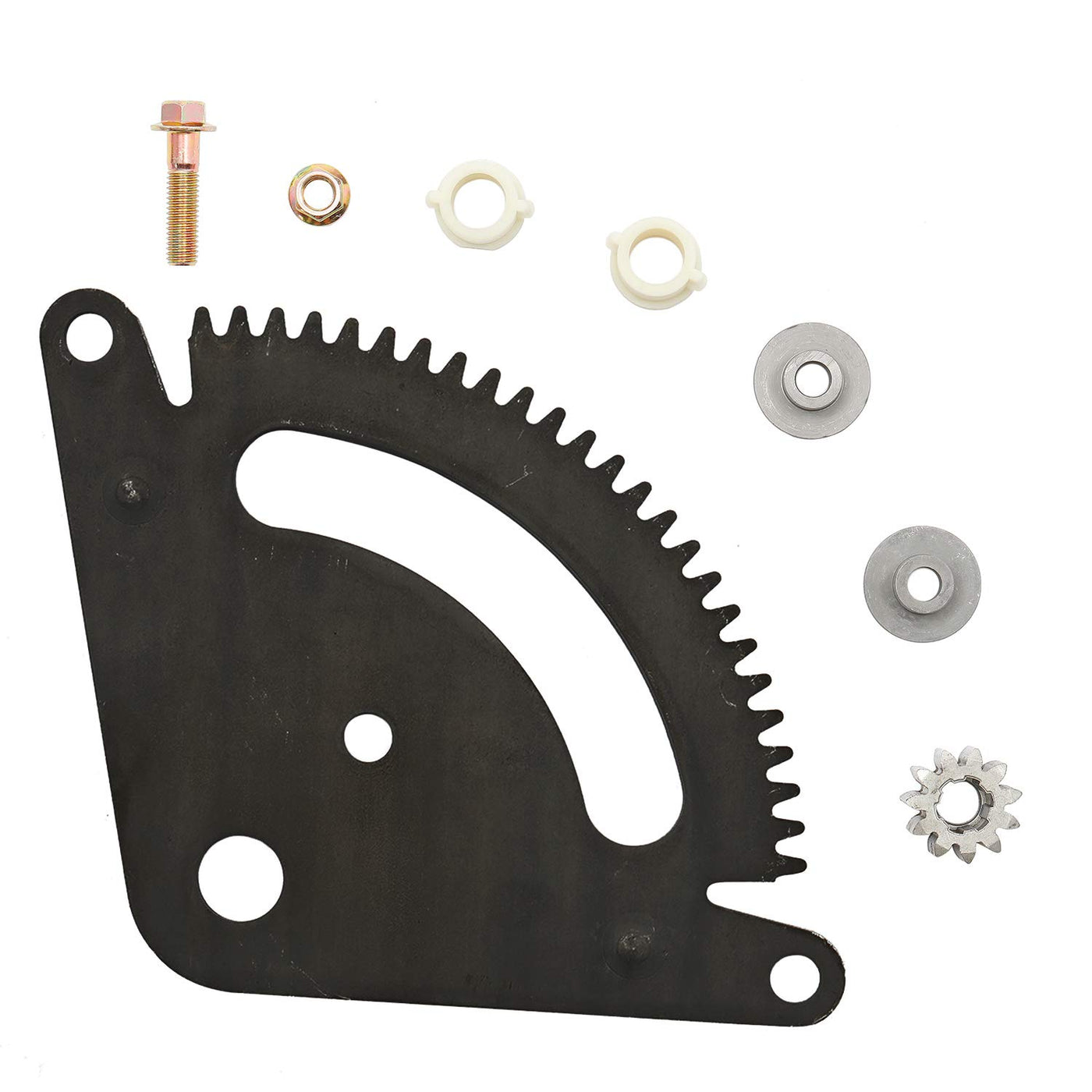 Q: What does the package include in the Steering Sector Pinion Gear Rebuild Kit?A: The package includes one set of sector plate, pinion gear, nut and bolt, two sets of metal bushings, and two plastic bushings, as shown in the product images.