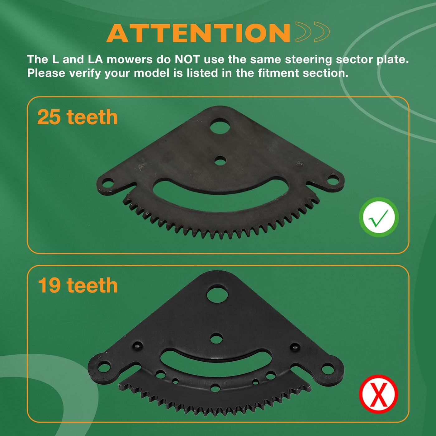 Q: How can I ensure this kit fits my mower model?A: To ensure compatibility, verify that your mower model is listed in the fitment section of the product description, as the L and LA mowers do not use the same steering sector plate.