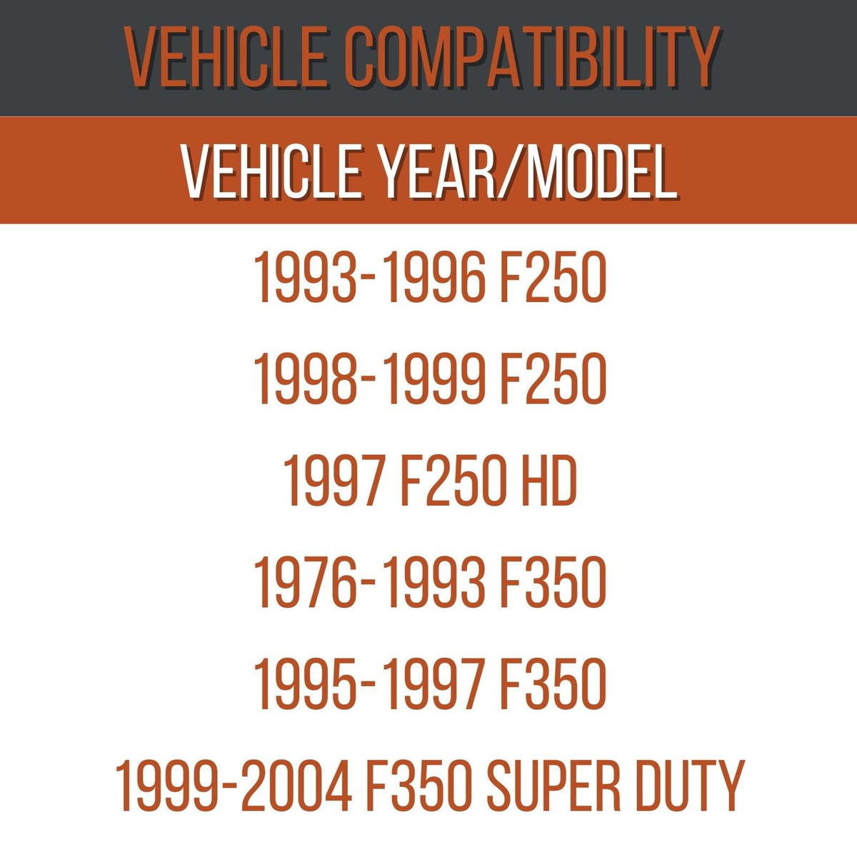 Q: What vehicles are compatible with the Mile Marker 1 Ton Nut Conversion Kit?A: The Mile Marker 1 Ton Nut Conversion Kit is compatible with various models including 1976-1993 F350, 1988-1997 F Super Duty, 1995-1997 F350, 1993-1996 F250, 1997 F250 HD, 1998-1999 F250, and 1999-2004 F350/F450 Super Duty trucks, specifically for 4WD vehicles.