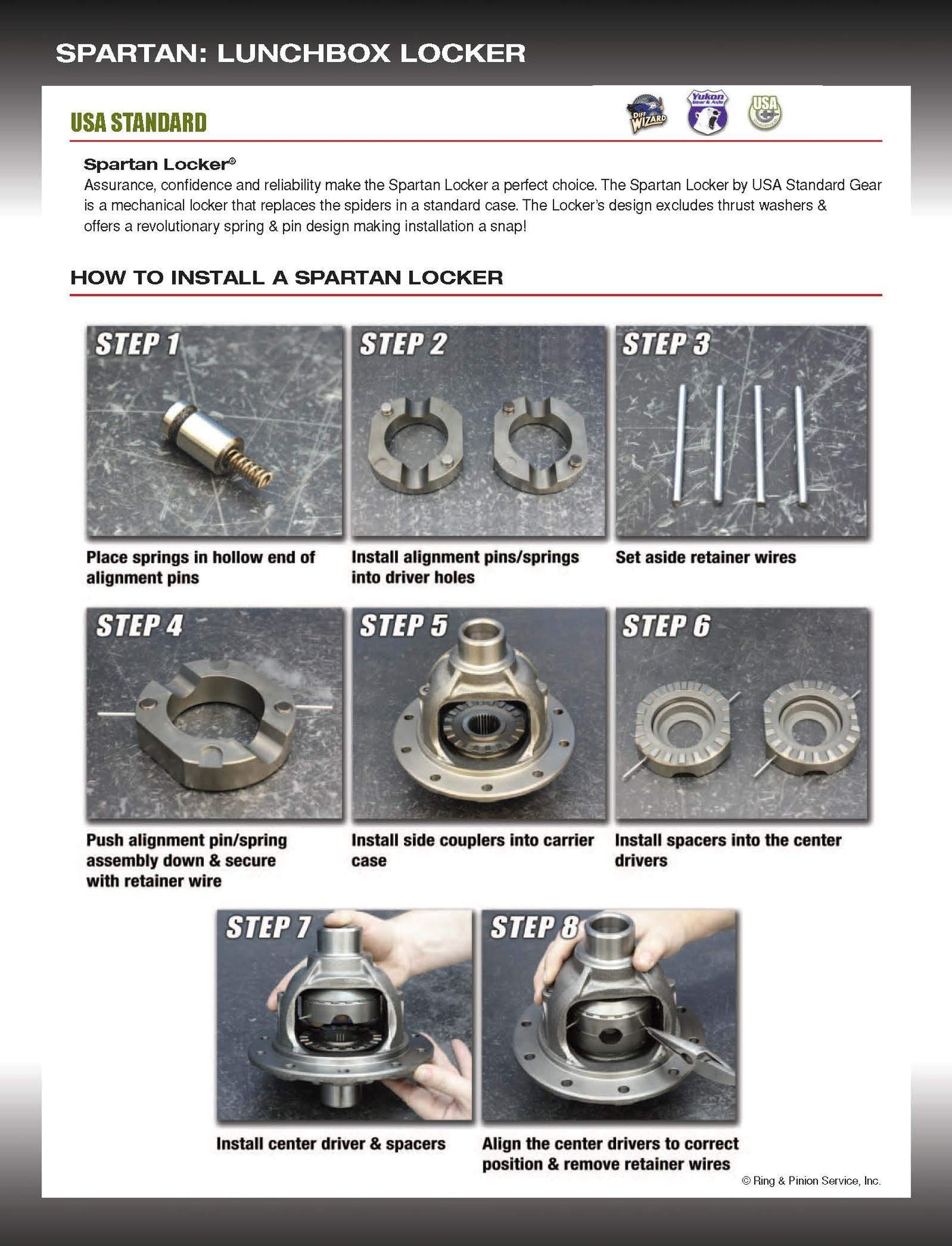 The Spartan Locker, by USA Standard Gear, provides reliable traction at a low cost. The Spartan locker's design does not use the thrust washers and has a revolutionary spring and pin design that makes installation a snap!