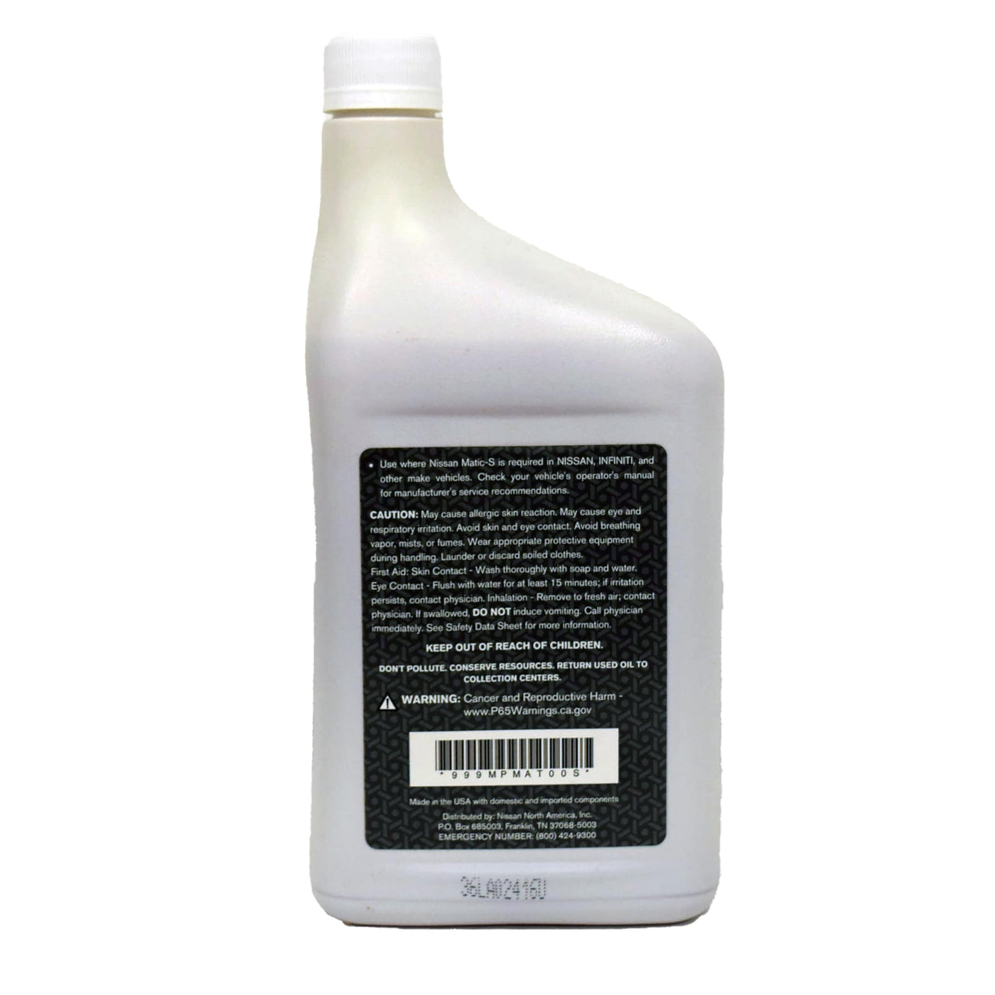 *Refer to owner's manual for fluid specifications. We are not responsible for transmission damage/failure due to improper fluid addition or exchange (incorrect fluid level will damage transmission). All maintenance should be performed by a factory trained technician certified by Nissan North America*999MP-MTS00P - Genuine Nissan Matic-S Transmission Fluid (Qty. 5 Quarts)