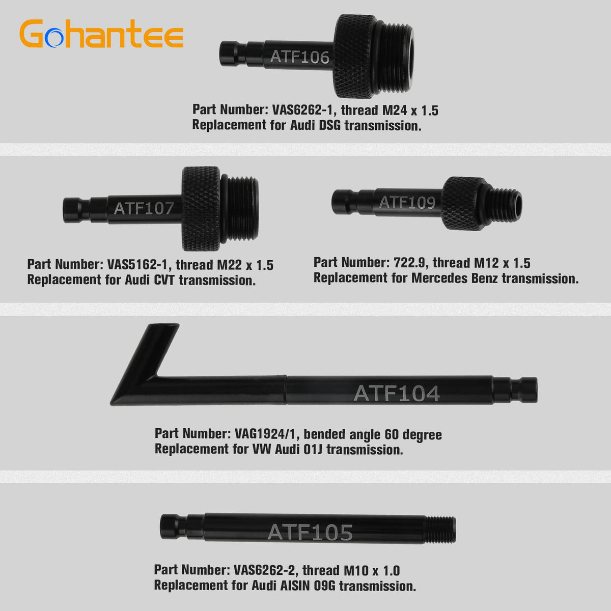 Feature:Brand newMade of high quality materialExcellent sealing to prevent leakage for safety.Strict quality control standards to build and test.Specifications:Item: Transmission Automatic Fluid Oil Filling Filler AdapterMaterial: Aluminum alloy, copperColor: BlackAdapter ATF106: Part Number: VAS6262-1, thread M24 x 1.5Replacement for Audi DSG transmission.Adapter ATF105: Part Number: VAS6262-2, thread M10 x 1.0Replacement for Audi AISIN 09G transmission.Adapter ATF104: Part Number: VAG1924/1, bended angle 60 degreeReplacement for VW Audi 01J transmission.Adapter ATF107: Part Number: VAS5162-1, thread M22 x 1.5, Replacement for Audi CVT transmission.Adapter ATF109: Part Number: 722.9, thread M12 x 1.5Replacement for Mercedes Benz transmission.Metal ball valve adapter:Connect: 1.0mm outer diameter hose, filler adapterWith shut-off valve, convenient to adjust and switch the liquid flow and easy to use.Application:Transmission fluid keeps automatic transmissions lubricated and running smoothly and helps avoid clutch wear. If you're working on a transmission, or need to fill transmission fluid because you don't have a dipstick, then you'll need this transmission manual filler kit to help you.Package Included: 1pc x metal distributor1pc x hook tube1pc x 09G transmission adapter1pc x 01J CVT adapter1pc x 722.9 adapter1pc x DSG transmission adapter