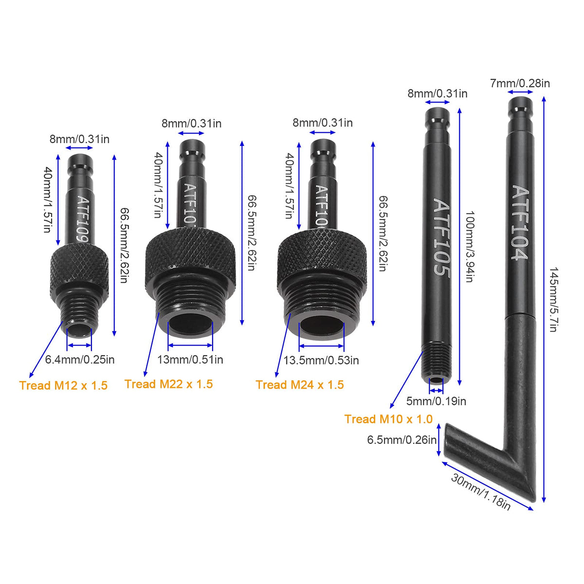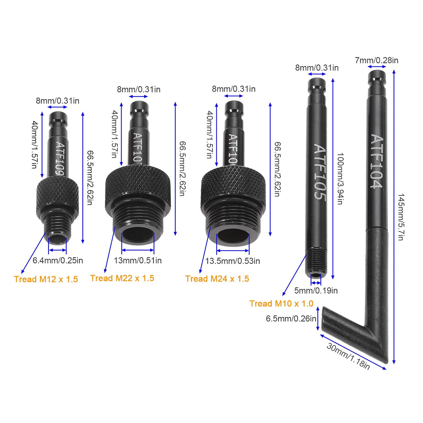 Item: Transmission Fluid Oil Filling Filler Adapter, 5Pcs, Includes Material: Aluminum Alloy Item 1: Part Number: Vas6262-1, Thread M24 X 1.5, Replacement For Audi Dsg Transmission Item 2: Part Number: Vas6262-2, Thread M10 X 1.0, Replacement For Audi Aisin 09G Transmission Item 3: Part Number: Vag1924/1, Bended Angle 60¡Ã, Replacement For Vw Audi 01J Transmission Item 4: Part Number: Vas5162-1, Thread M22 X 1.5, Replacement For Audi Cvt Transmission Item 5: Part Number: 722.9, Thread M12 X 1.5, Replacement For Mercedes Benz Transmission