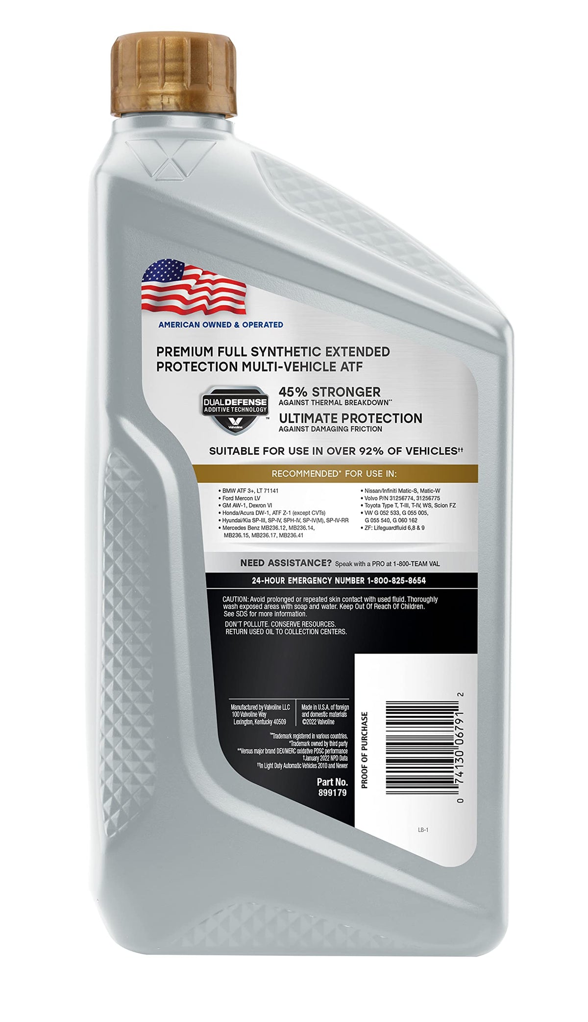 Modern transmissions are better than ever, with more gears to help improve fuel efficiency and acceleration. Greater performance calls for greater protection. Valvoline Extended Protection Full Synthetic ATF features our exclusive Dual Defense Additive Technology for two layers of protection against metal-on-metal contact and thermal breakdown, all while minimizing wear on clutch components. In fact, Valvoline Extended Protection Full Synthetic ATF is 45% stronger against breakdown compared to major brand DEX/MERC oxidative PDSC performance. Proven to maximize transmission life, our patented formula is suitable for use in 92% of vehicles in light duty automatic transmissions 2010 and newer. Keep your modern vehicle shifting smoothly, mile after mile, with the ultimate protection you can only expect from Valvoline, the #1 ATF brand.