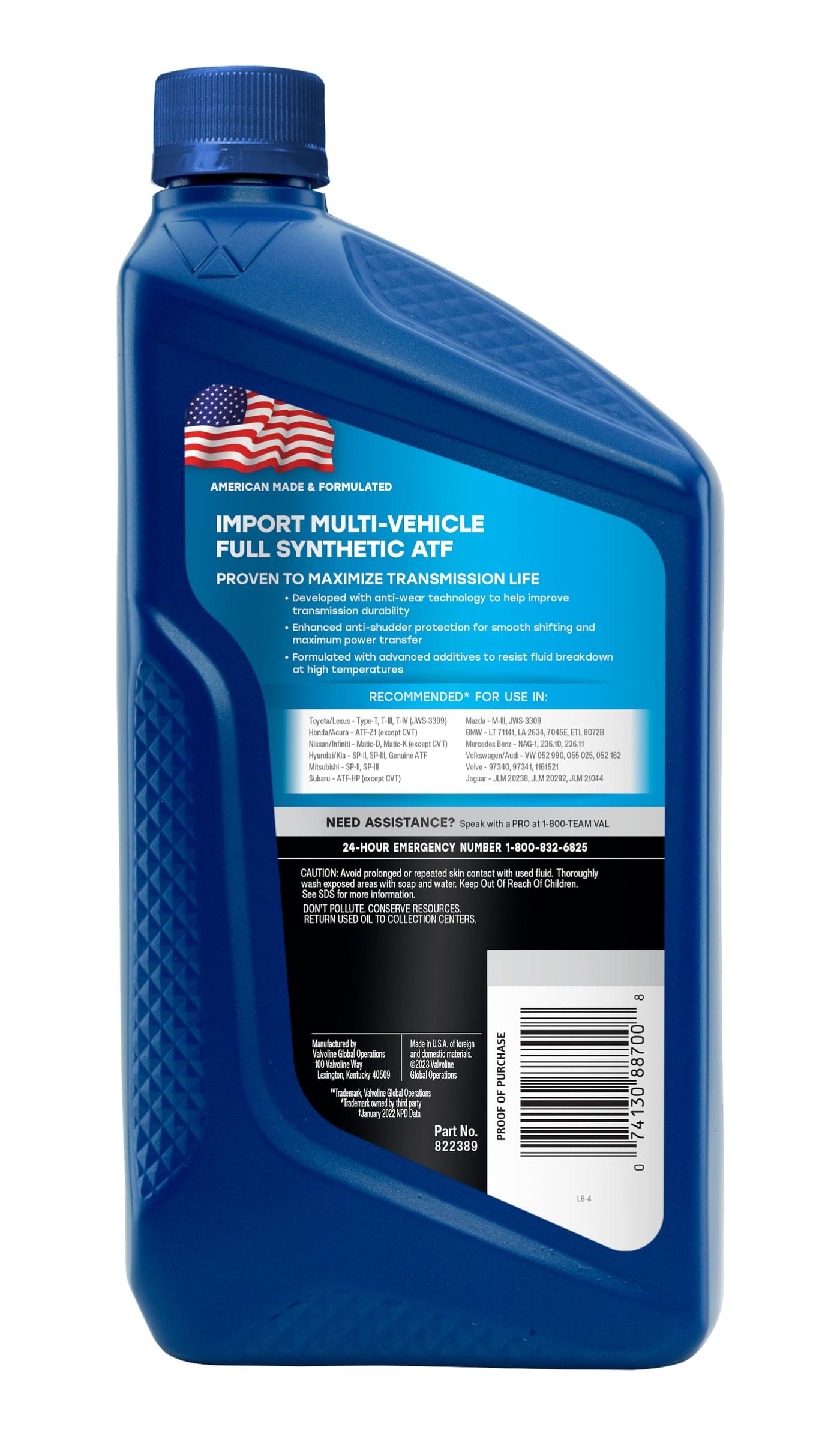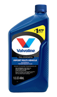 Valvoline Import Multi-Vehicle ATF is the full-synthetic automatic transmission fluid that has been specially engineered to meet and exceed the requirements of most imports and domestics with automatic transmissions. Formulated with advanced additives to prevent the major causes of transmission breakdown, its designed to help prevent leaks, reduce wear and tear, and maximize performance - all for much longer than conventional fluids. It has improved thermal stability for longer fluid life, better viscosity stability for consistent transmission operation, and specific frictional enhancements for smooth gear engagements. Valvoline Import Multi-Vehicle ATF is suitable for a broad range of automatic transmissions including most Toyota, Honda, Nissan, Hyundai, Kia, BMW, Volvo, VW and other import and domestic vehicles. Its specifically recommended for use in the following applications: BMW LT 71141 and ETL-7045E; Nissan/Infiniti Matic-D, Matic-K and Matic-J; Mitsubishi Diamond SP-II and SP-III; Subaru ATF-HP; Hyundai/Kia SP-II and SP-III; and Toyota/Lexus Type T. For the many shifts and miles ahead, trust your transmission with Valvoline, the #1 automatic transmission fluid brand.