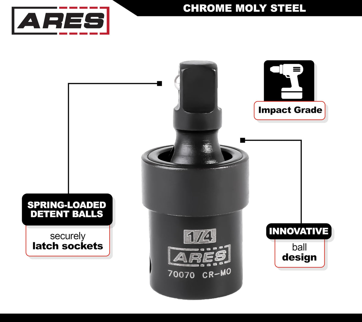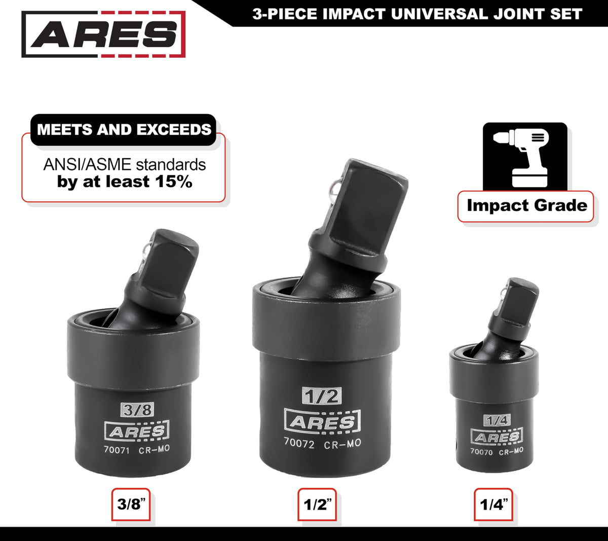 Don't Get Stranded With A Busted Universal SocketThe ARES Impact Universal Joint Set features an innovative ball design that distributes torque loads evenly over a greater surface area, enabling an improved action range of motion for easier access to hard to reach areas with significantly enhanced strength and life over traditional sockets. Made from high-strength, premium Chrome Moly steel with a Manganese Phosphate coating to resist corrosion, these universal joints are designed for use with all cordless, electric, and pneumatic impact wrenches and are laser-etched for easy identification. Spring-loaded detent balls securely latch and the through-hole in the drive end locks onto the drive tang, so you can work securely and safely, even in tight spots. Features: Includes: 3 pc. impact universal jointsOne 1/4-inch drive One 3/8-inch drive One 1/2-inch drive Designed for use with all cordless, electric, and pneumatic impact wrenchesConstructed of high-strength, premium Chrome Moly steelManganese Phosphate coating resists corrosionLaser-etched for easy identificationInnovative ball design that distributes torque loads evenly over a greater surface areaImproved action range of motionSpring-loaded detent balls securely latch and through-hole in the drive end locks onto drive tangThese tools meet and exceed ANSI/ASME standards