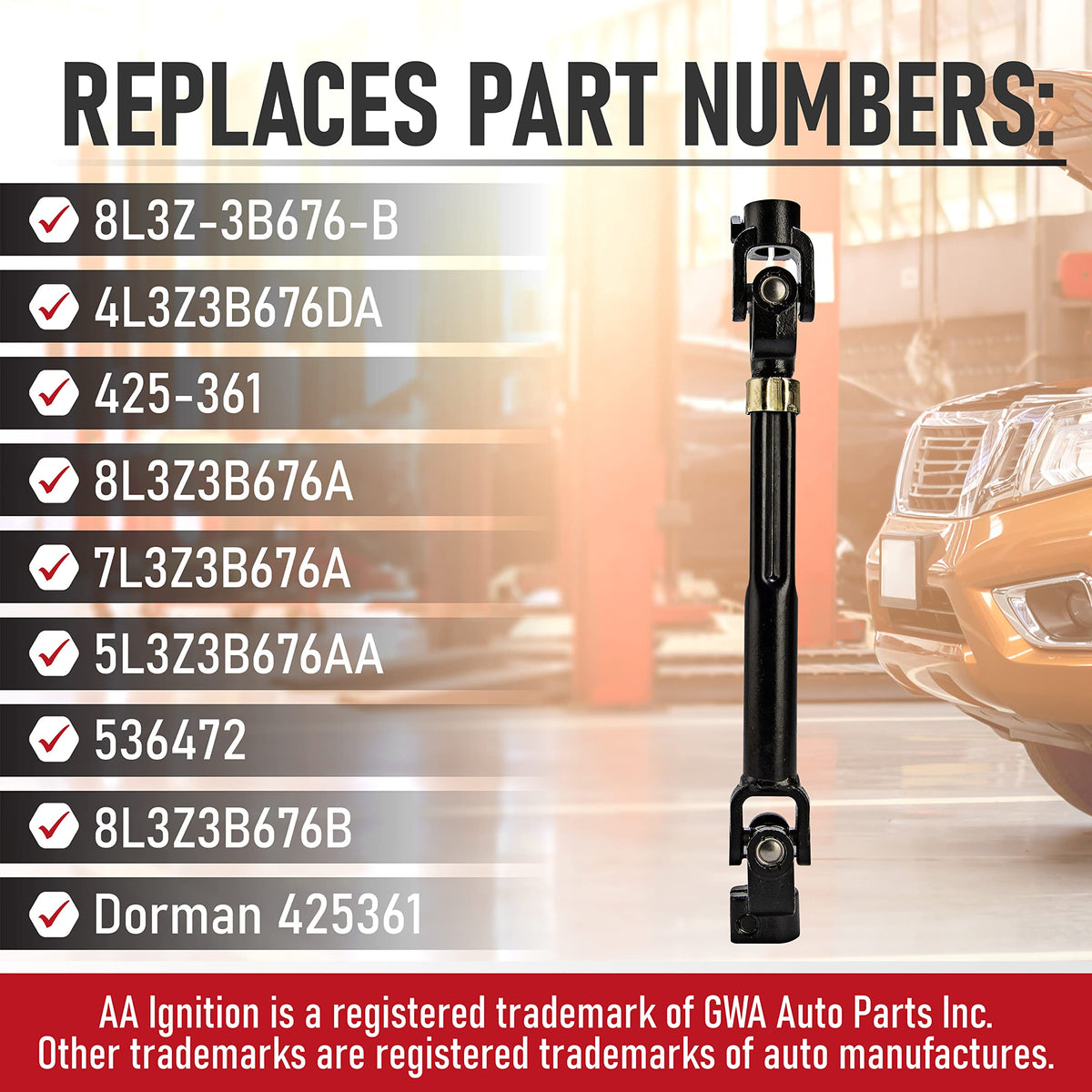 The Intermediate Steering Shaft Keeps The Steering Gearbox And Steering Wheel Connected. The Universal Joint Or Also Called As U-Joint At The End Of The Steering Shaft Connects To The Steering Gearbox Which Has Another U-Joint That Connects To The Steering Wheel Allows For The Angles Between Them To Be Supported Resulting To Your Vehicle Wheels Smooth And Easy Turning. The Intermediate Steering Shaft Is An Important Component Of Your Vehicle. It Is Unsafe To Drive With A Bad Steering Shaft On Your 4.6L Or 5.4L Vehicle And May Put Other People'S Lives With You At Risk As Well. If You Are Experiencing Strange Sounds, Loose Steering Wheel Tilt, Difficulty In Turning Or Your Steering Wheel Does Not Go Back To The Center After Turning Then You May Have A Problem With Your Intermediate Steering Shaft. Fits The Following Vehicles: 2004-2008 F-150 2006-2008 Mark Lt Replaces Part Numbers: 8L3Z-3B676-B, 4L3Z3B676Da, 425-361, 8L3Z3B676A, 7L3Z3B676A, 5L3Z3B676Aa, 536472, 8L3Z3B676B, Dorman 425361 This Is A Compatible Replacement Part Manufactured By Aa Ignition. This Intermediate Steering Shaft Is Not A Genuine Oem Part. Vehicle Makes And Their Associated Vehicle Models And Part Numbers Are Used In This Listing Only To Identify The Vehicles This Intermediate Steering Shaft Fits.