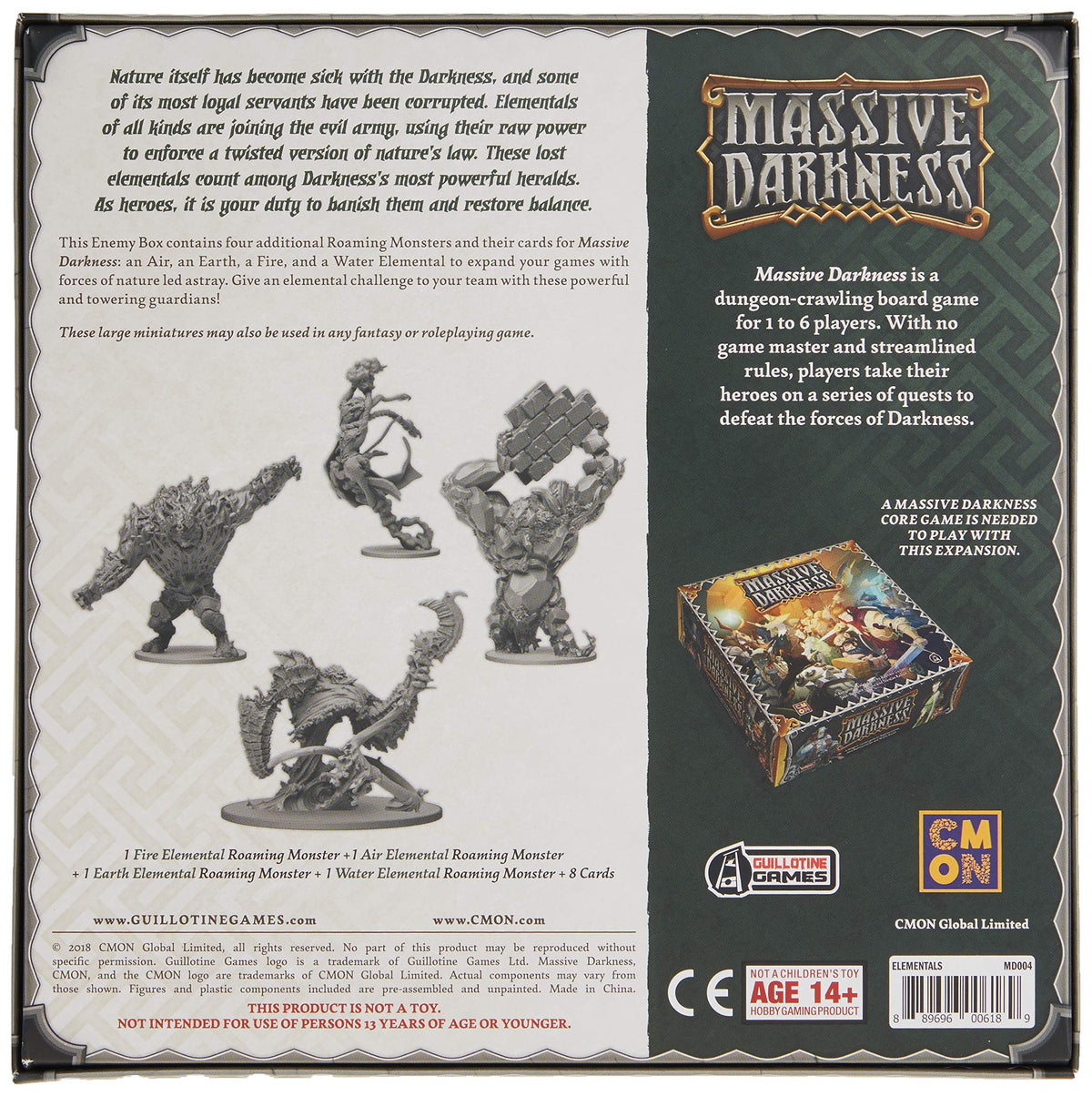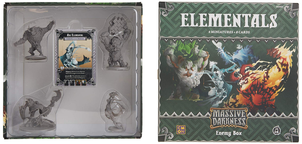 Q: What miniatures are included in the CMON Massive Darkness: Elementals set?A: The CMON Massive Darkness: Elementals set includes four beautifully sculpted miniatures representing the Elementals of Wind, Water, Fire, and Earth.
