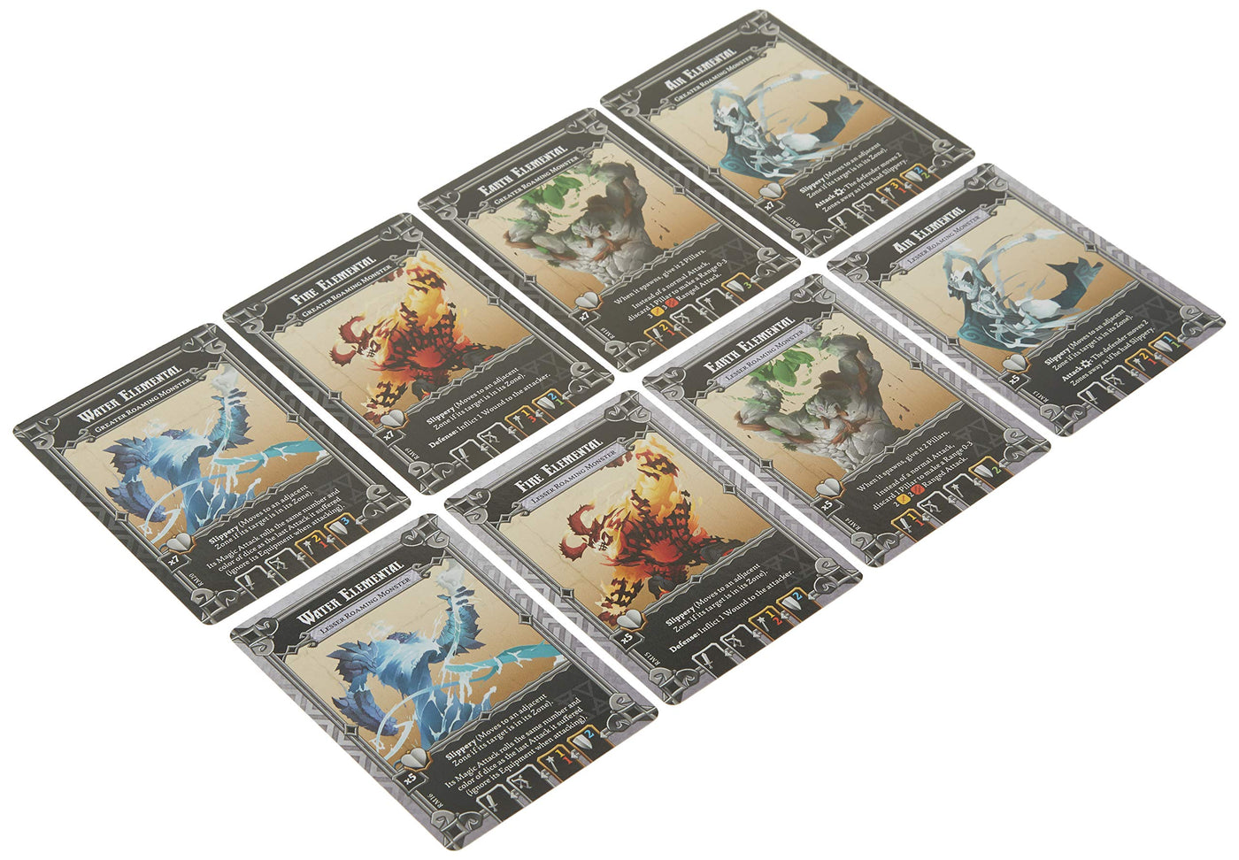 Q: How can I use the Elemental miniatures in my games?A: These Elemental miniatures can be used as either lesser or greater Roaming Monsters in your games of Massive Darkness, thanks to the eight included stat cards. This allows for diverse gameplay scenarios and challenges.