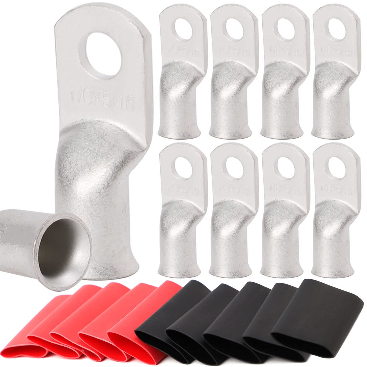 Q: What comes in the package with the battery cable lugs?A: The package includes 4 marine grade battery terminal lugs and 4 pieces of 3:1 heat shrink tubing (2 black and 2 red) for secure connections.