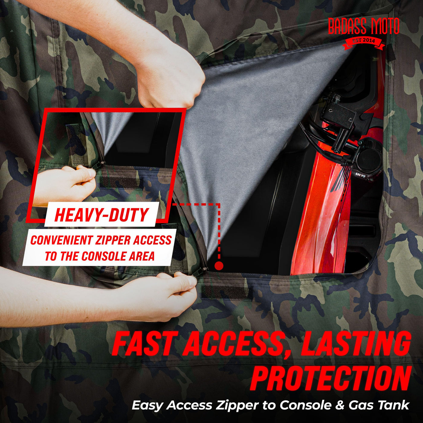 Q: Can I access my ATV's gas tank while the cover is on?A: Yes, the cover includes an easy-access zipper panel that allows you to quickly reach your gas tank, console, and handlebars without needing to remove the entire cover.