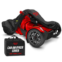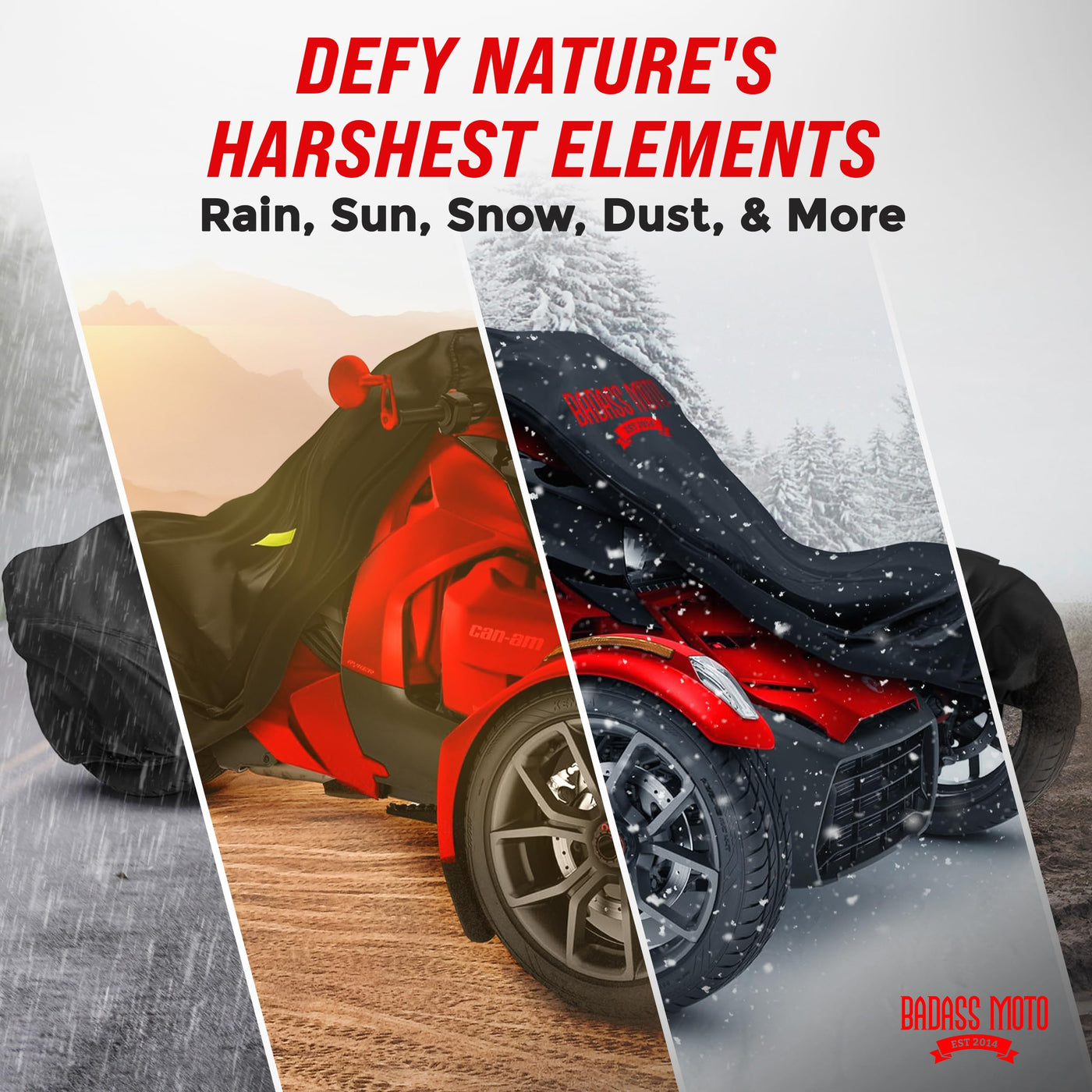 Discover Unparalleled Quality: So much more than a run of the mill canam Ryker cover. Developed and rigorously tested by American riders, our innovative covers rival high end Can-am accessories that can be more than twice the price. Featuring top-grade materials and workmanship, A Badass Moto advanced 3 wheeler cover surpasses other Can-Am trike covers in it 's protection, keeping your ride drier and cleaner. Loaded with important features not found on lesser coversHeat-resistant lower exhaust area allows quick covering post-rideDouble breathable vents prevent condensation and rust. Secured with a durable elastic hem and an extra wind protection buckle strap WIth Badass Moto your Can-Am motorcycle stays protected in style. Always 100% Satisfaction Guaranteed - Experience unmatched value today!