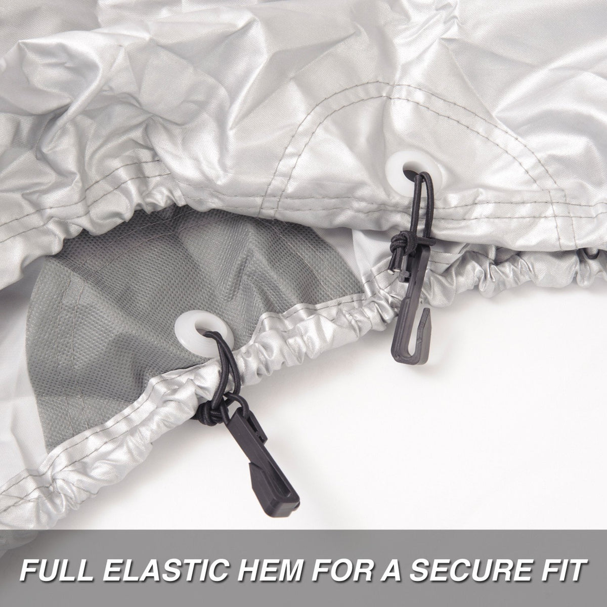 Q: How does the cover stay secure on my motorcycle?A: This motorcycle cover features a full elastic hem, which keeps it securely attached to your bike, preventing it from being blown away by the wind or shifting during use.