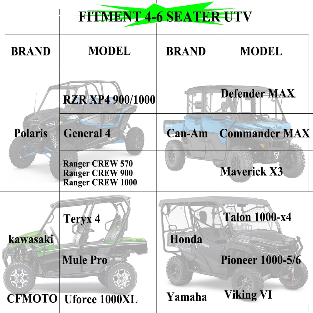 The 4-6 seater cover is made of durable 420D Oxford polyester fabric, weighs 3.35kg and is externally waterproof and dustproof. Double thread sewing, longer use time, more protection UTV. Size:L:430cm(169'')*W:150cm(59'')*H:170cm(67''), fits most 4-6 seater utv, please measure the size before you buy. Fits Polaris RZR general ranger crew 570 900 1000 , CFMOTO UForce 1000 XL, Can-Am defender max commander max, Kawasaki teryx 4 mule pro,Hisun 750 crew,Axis 750 crew,Yamaha vinking Design:One zipper on the side for easier installation and removal;Four wheel straps and One belly strap keep your utv well protected from storms, strong winds and harsh outdoor conditions. Matching storage bag, when not in use, just fold the lid and put it in, easy to store and carry.