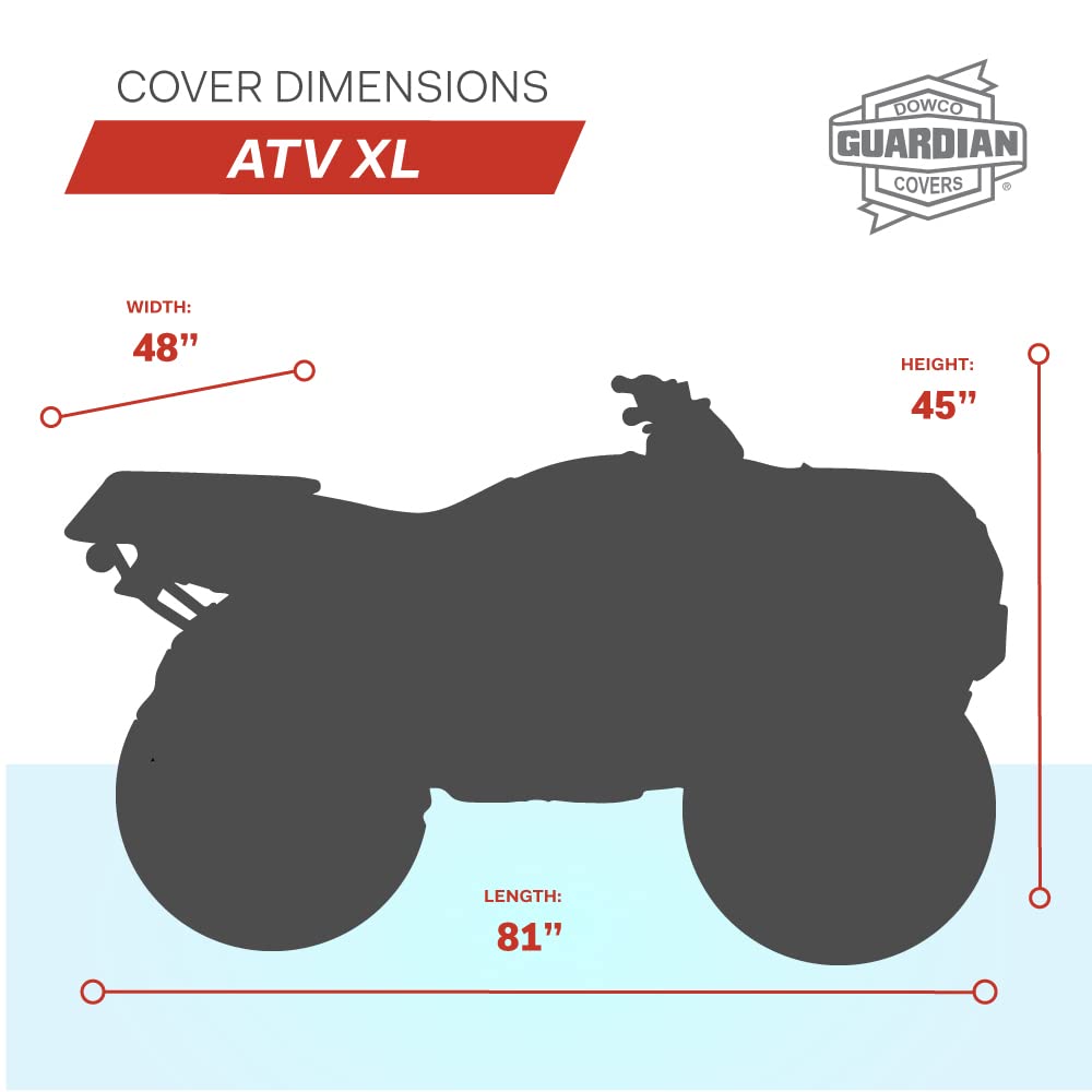 Q: What size ATV does the Dowco Guardian ATV Cover fit?A: The Dowco Guardian ATV Cover is designed to fit X-Large ATVs, accommodating models with front and rear baskets for optimal coverage.