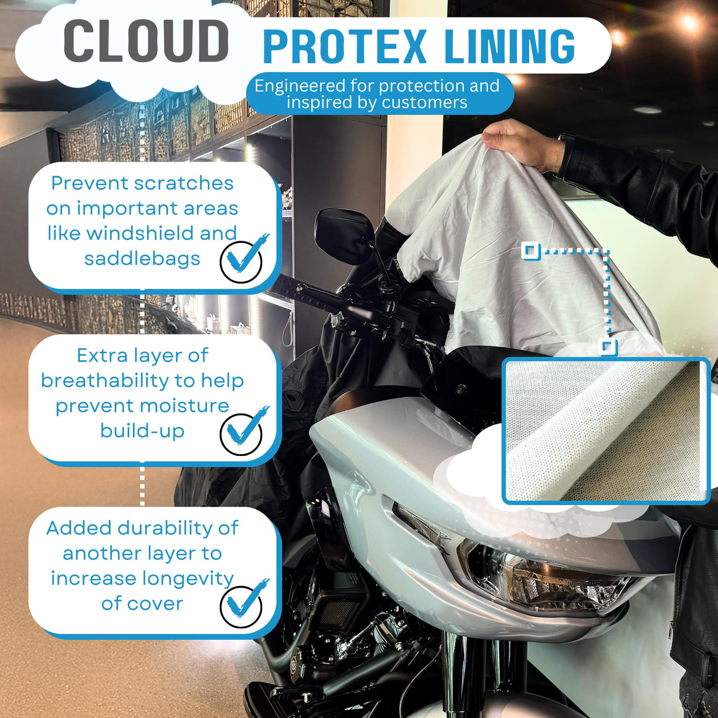 Hiwaystar 500 XXL - Eagle Logo with 45'' cable & lock set. This is top of the line motorcycle cover. If your bike is exposed to harsh elements, lives outdoors or you simply want the best, this is your cover. Heavy duty 300 denier polyester fabric. 100% waterproof, heavy duty weatherguard polyester with UV treated. All seams are double top stitches with nylon thread and heated seam sealed. Heat resistant THERMO GUARD nylon on lower areas. Soft cloth fabric lining on windshield areas resist scratches. Flow through ventilation prevents condensation. Large, heavy duty grommets at center and front wheel for locking cover with bike. Includes covering bags. Color: Black with silver night reflector trim Size XXL for full dress tourer and chopper Honda Goldwing, Yamaha Royal Venture, Kawasaki Nomad and Harley Electra Glide, Street Glide, Road Glide and Road King with all accessories. also, medium cruisers like Harley Heritage and Fatboy, Suzuki Boulivard C50, Kawasaki Vulcan LT Classic with windsheilds, saddlebags, sissybars and engine guards. Dimension: XX-Large: Touring/Full Dress 1500cc and larger with fairings and bags. Dimension: 111.5''L x 45''W (Front) x 52.5''H (Side)