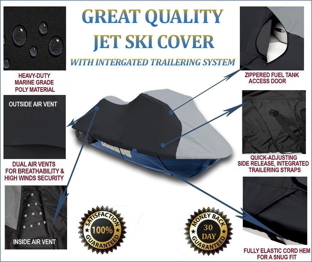 Q: Can I use this cover while towing my Jet Ski?A: Yes, the SBU Jet Ski Cover features an integrated trailering system with built-in quick adjusting straps, making it trailerable and suitable for use on the road while transporting your Jet Ski.