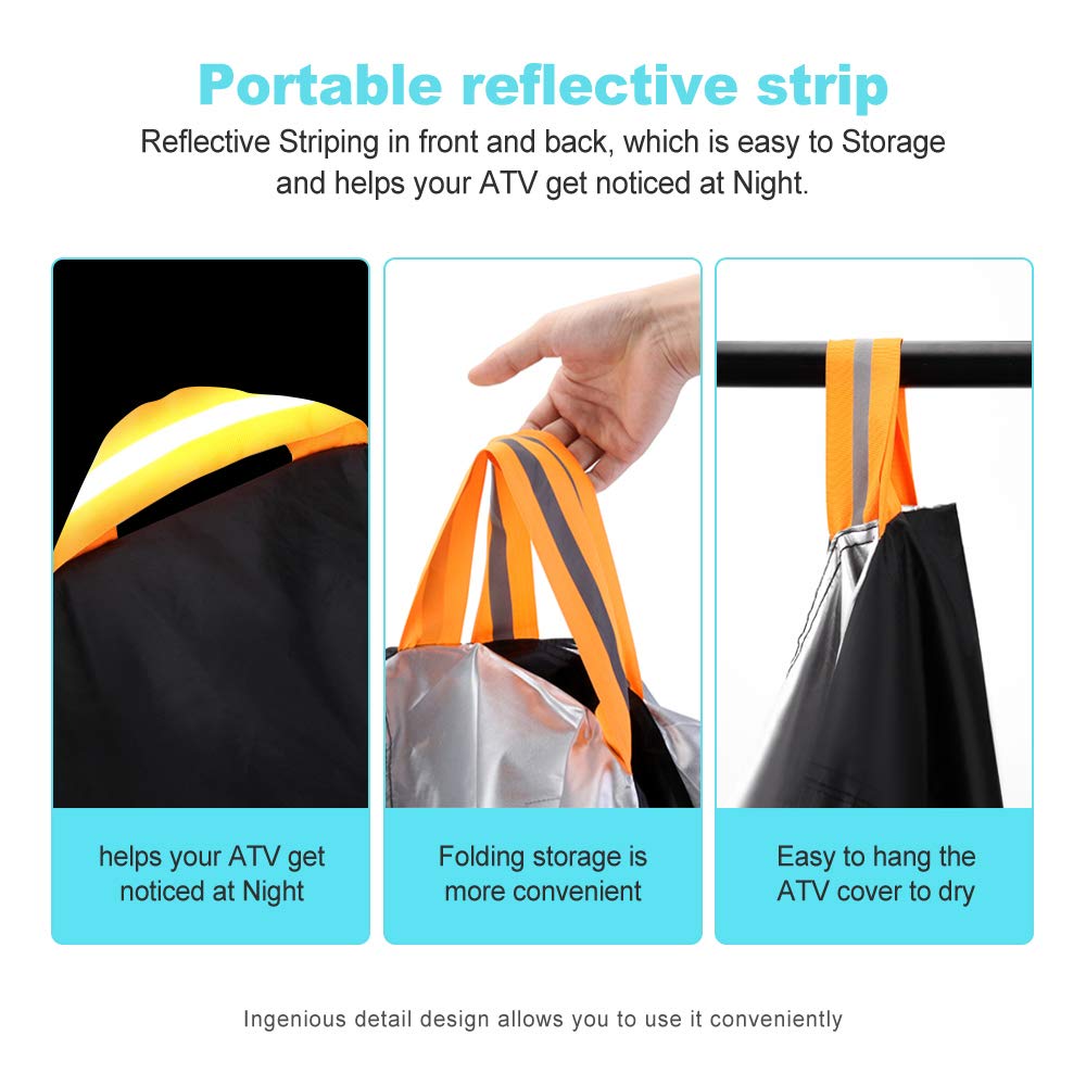 Q: Can I use the ATV cover in different weather conditions?A: Absolutely! The NEVERLAND ATV Cover is designed for all-weather usage. In summer, the silver face provides UV protection, while the black face offers heat absorption in winter to help melt snow and prevent accumulation.