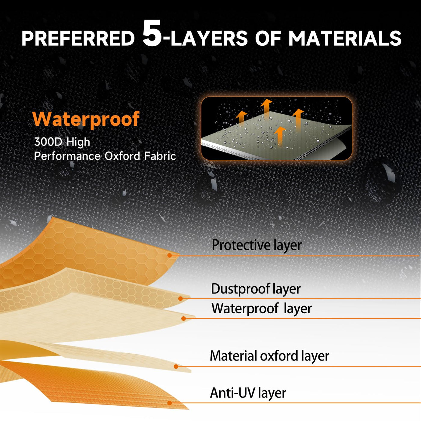 Q: What materials are used in the NEVERLAND UTV Cover?A: The NEVERLAND UTV Cover is made from durable 300D high-performance waterproof denier oxford cloth, designed to protect your UTV from rain, wind, snow, sun, and other outdoor elements.