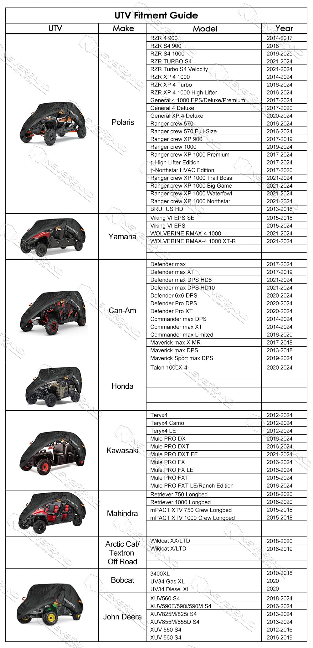 Q: Is this UTV cover compatible with different brands and models?A: Yes, the NEVERLAND UTV Cover is compatible with various brands including Polaris, RZR, Yamaha, Can-Am Defender, and Kawasaki Mule Ranger, fitting UTVs up to 157 inches in length.