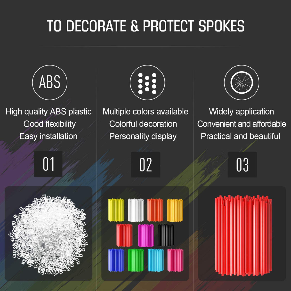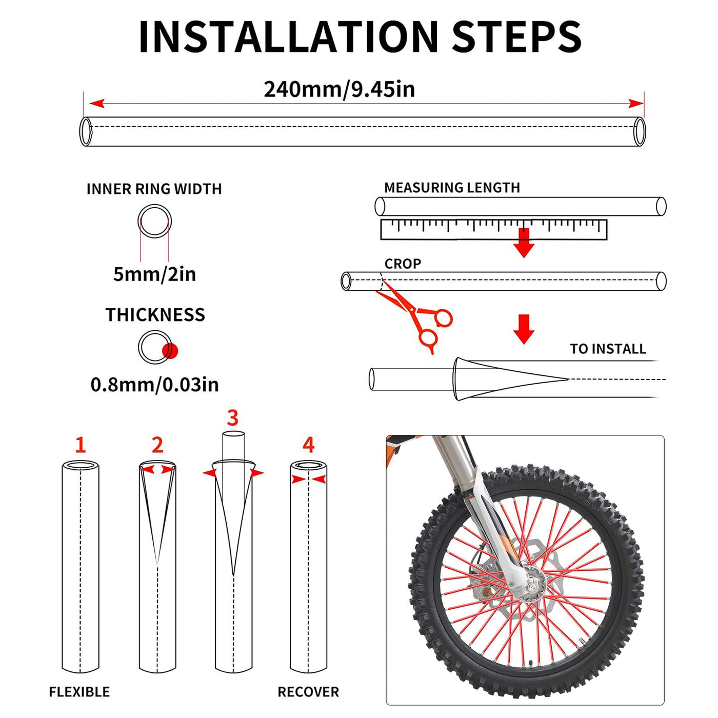 Feature: The Spoke skins are perfectly used for most spoke wheel. Do not increase the burden on the bike ,durable to use. Make your vehicle fashionable increase spokes' life. Tool-free installation with simple installation steps. Many colors are available and 72 pieces enough for two wheels.