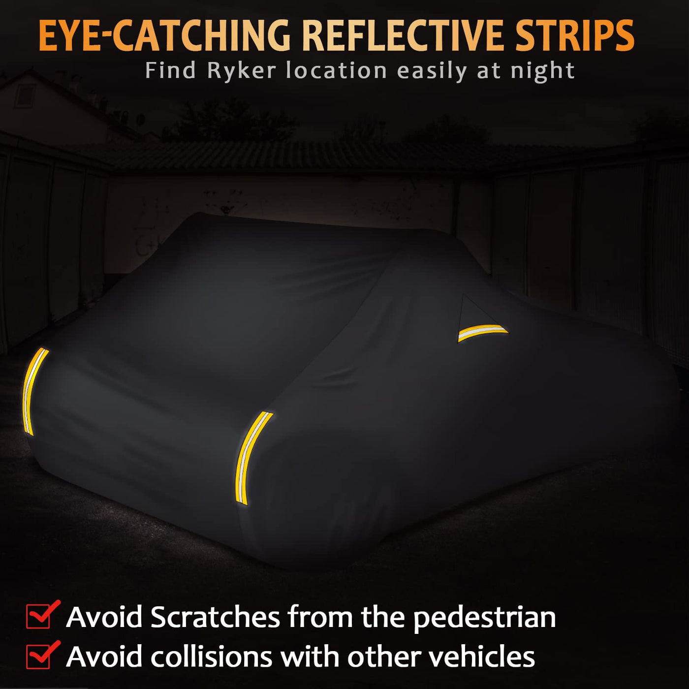 Q: How does the Ryker Cover protect against windy conditions?A: The cover includes thick windproof webbings, an adjustable elastic hem, and extra windproof buckle straps to keep it securely in place, preventing it from blowing off in high winds and rainstorms.