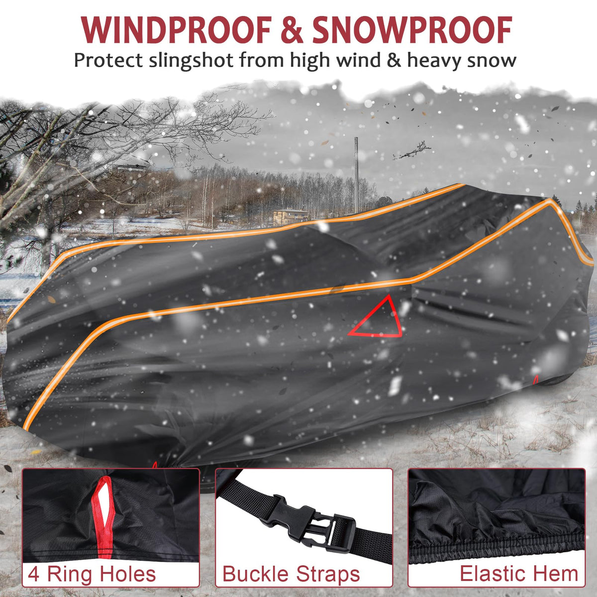 Q: Can this cover withstand strong winds and harsh weather conditions?A: Yes, the slingshot cover is designed with a heavy-duty windproof structure, including thicker webbings, an adjustable elastic hem, and extra windproof buckle straps to keep the cover secure during strong winds and rainstorms.