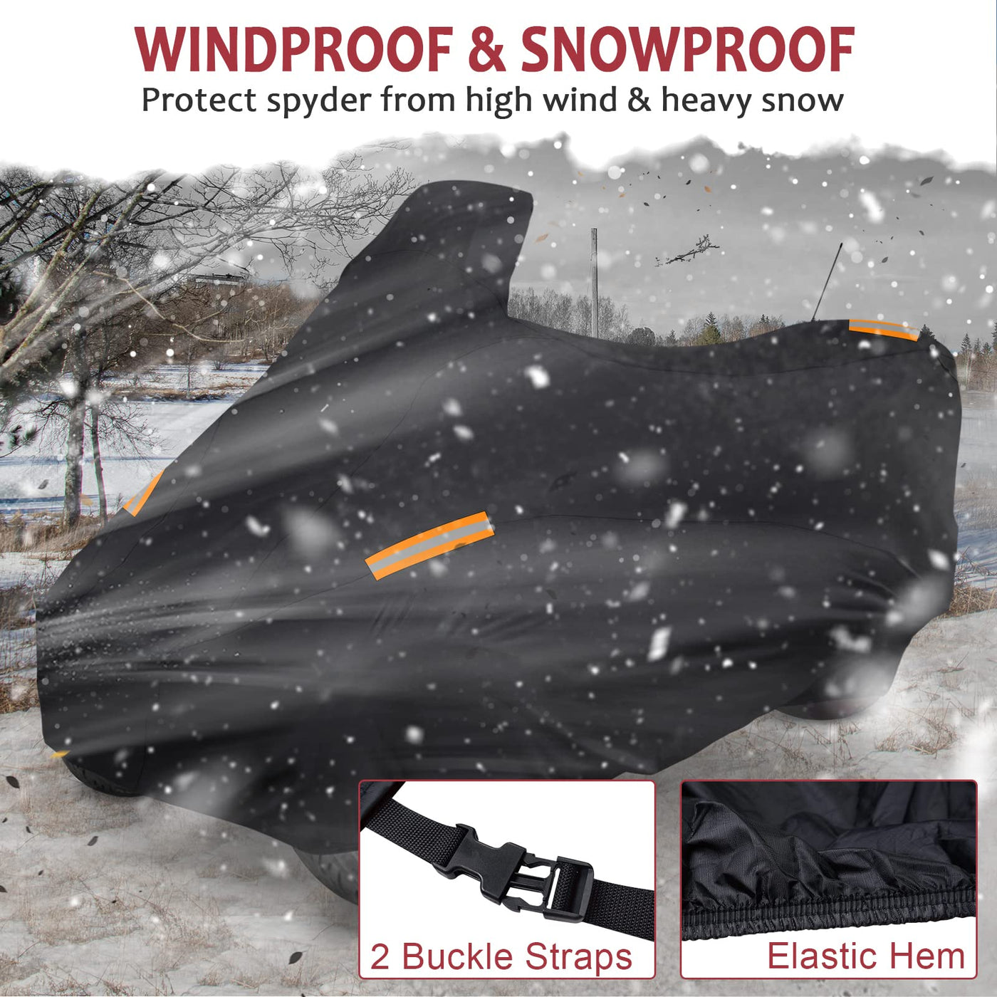 Q: How does the windproof feature work on the Spyder cover?A: The windproof design includes heavy-duty webbings and an adjustable elastic hem that keeps the cover securely in place, preventing it from blowing off in strong winds or rain.
