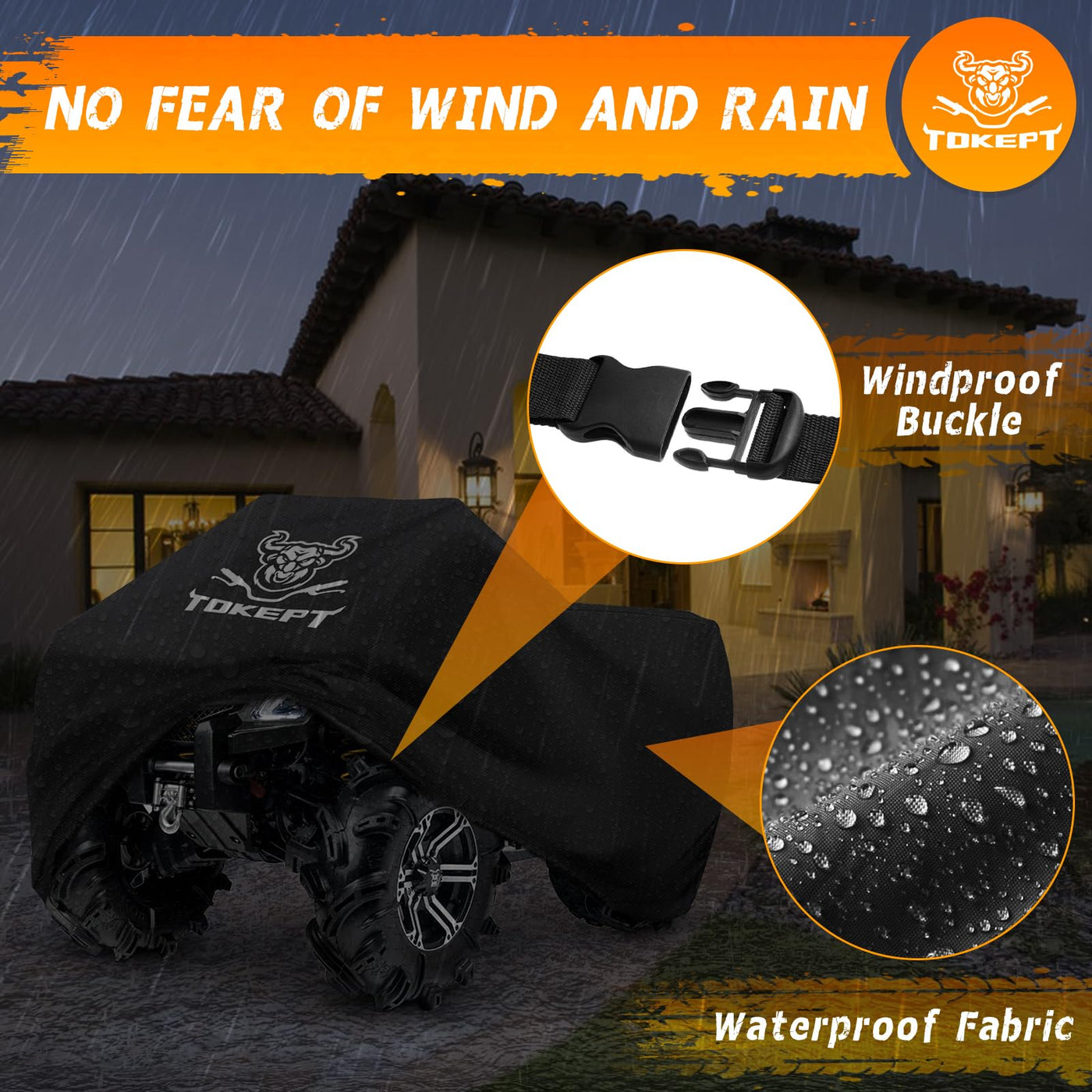 Q: Is the Tokept ATV Cover waterproof?A: Yes, the Tokept ATV Cover features multi-layer protection with a built-in waterproof coating, PU coating, and UV coating, ensuring maximum protection from rain, snow, and harsh weather conditions.