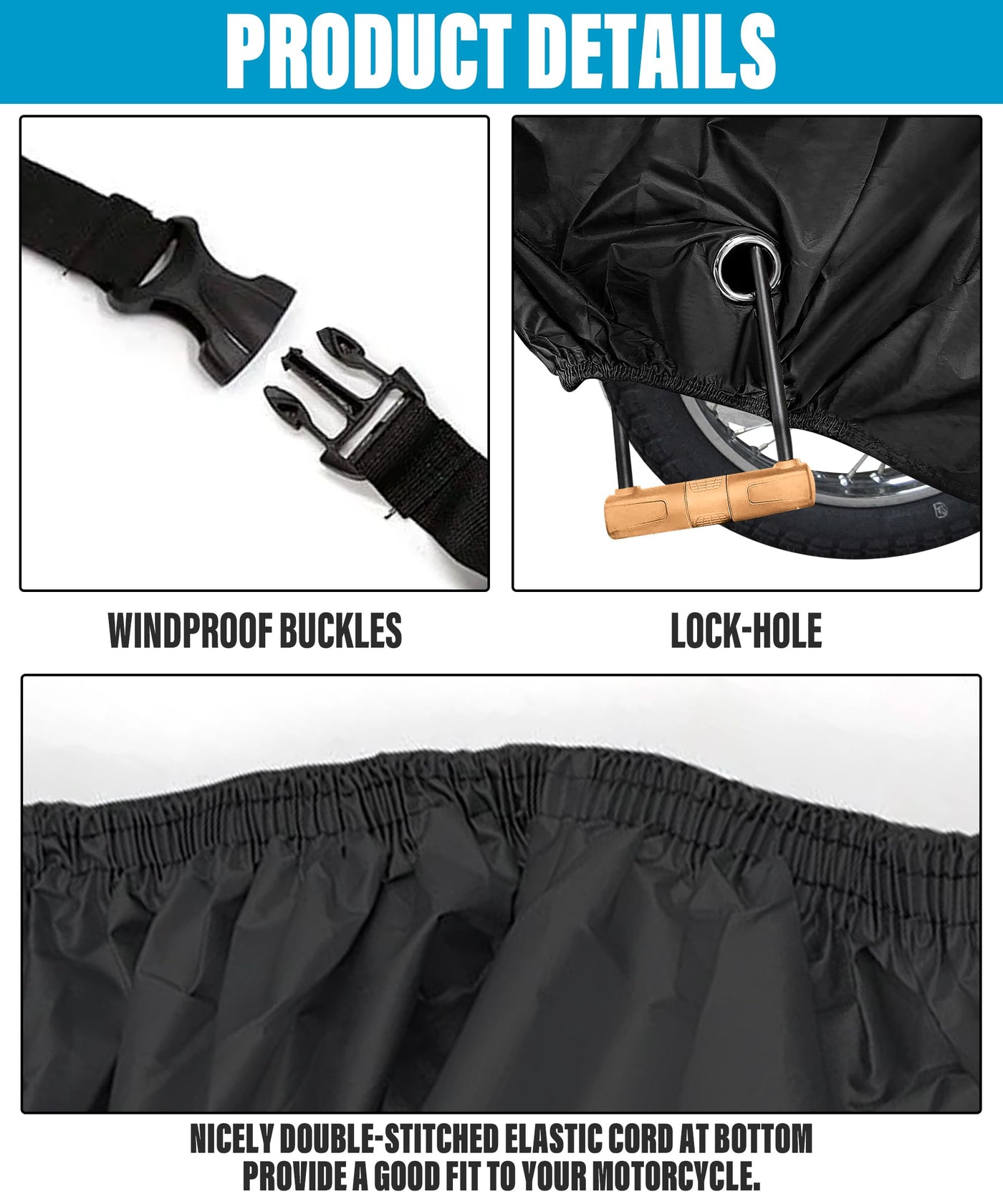 Q: Is the motorcycle cover easy to store when not in use?A: Yes, the waterproof motorcycle cover can be easily folded for convenient storage, ensuring it doesn't occupy much space and stays clean when not in use.