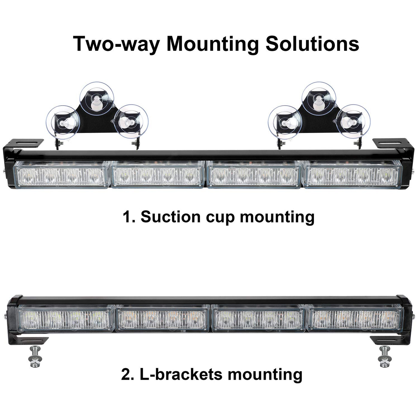 Q: How do I install the ASPL Strobe Light Bar?A: The ASPL Strobe Light Bar can be installed using one of two methods: it can be permanently mounted using L-shape brackets and screws, or it can be temporarily mounted with suction cups on the front or back windshield.
