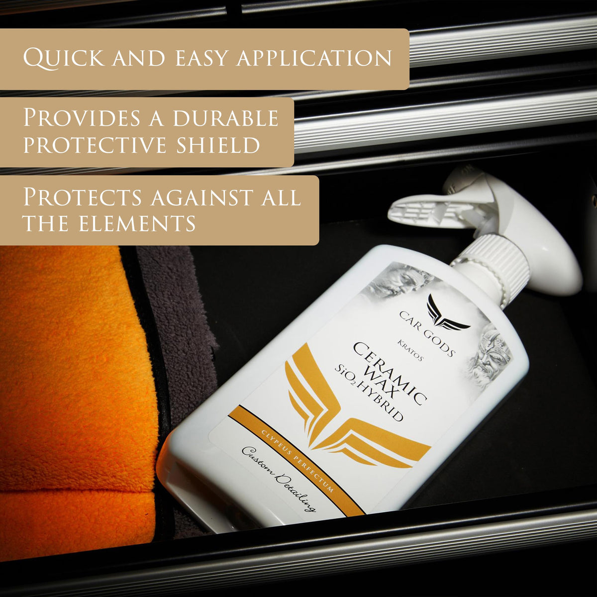 Q: How do I apply Car Gods Ceramic Wax?A: To apply Car Gods Ceramic Wax, spray it onto one panel at a time. Use a microfiber cloth to work the wax in a circular, overlapping motion, then finish by buffing the surface with a clean, dry microfiber cloth for the best results.