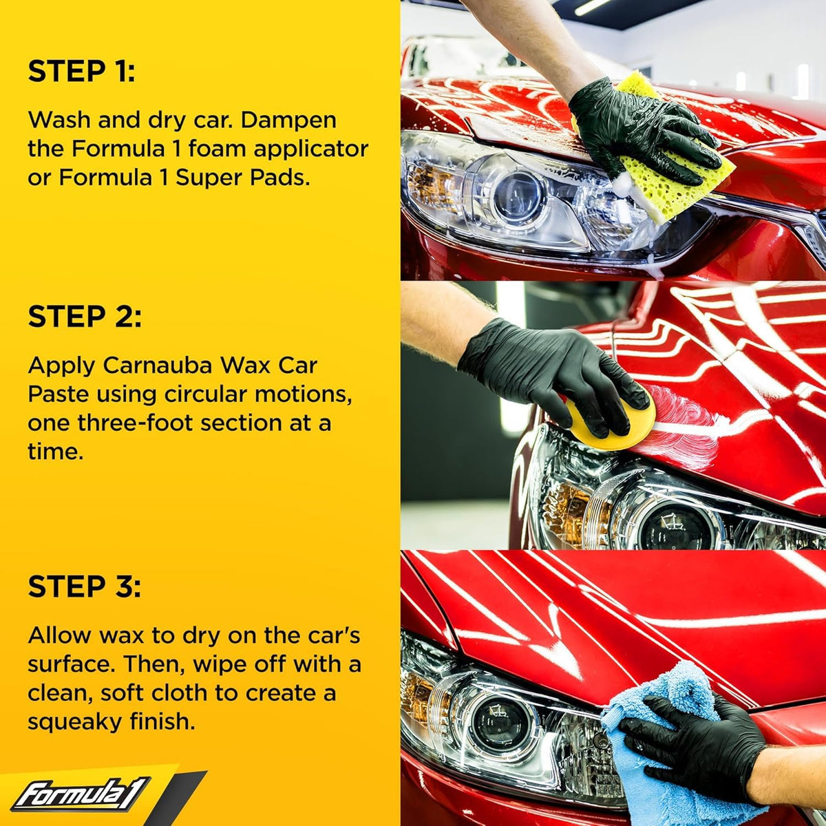 The Superior Shine of Carnauba: Formula 1 carnauba car wax contains #1 grade Brazilian carnauba, the world’s hardest wax. This natural polishing compound gives your car a glossy brand-new finish and water-beading protection that lasts. | Advanced Micropolishers: Our car polish helps bring out the true color of your car with its exclusive micropolishers that gently remove light scratches and haze from the clear coat. The result is an ultra smooth, high-gloss finish. | Easy to Use: You don't have to be a pro detailer with access to expensive tools to achieve a stunning shine. Simply rub on with the included foam applicator, allow to dry to a haze, and buff off with a clean microfiber towel. | Protects from Water and Oxide: The exclusive ingredients of Formula 1 exterior care products help prevent water stains and oxidation from corroding your auto paint finish. A periodic application of car wax paste is recommended for best results. | A Must-Have for Car Lovers: Formula 1’s car detailing supplies are ideal for auto enthusiasts who love the classic, warm glow of natural carnauba wax. Our paste wax never leaves any white powdery residue and provides a glossy finish that lasts!