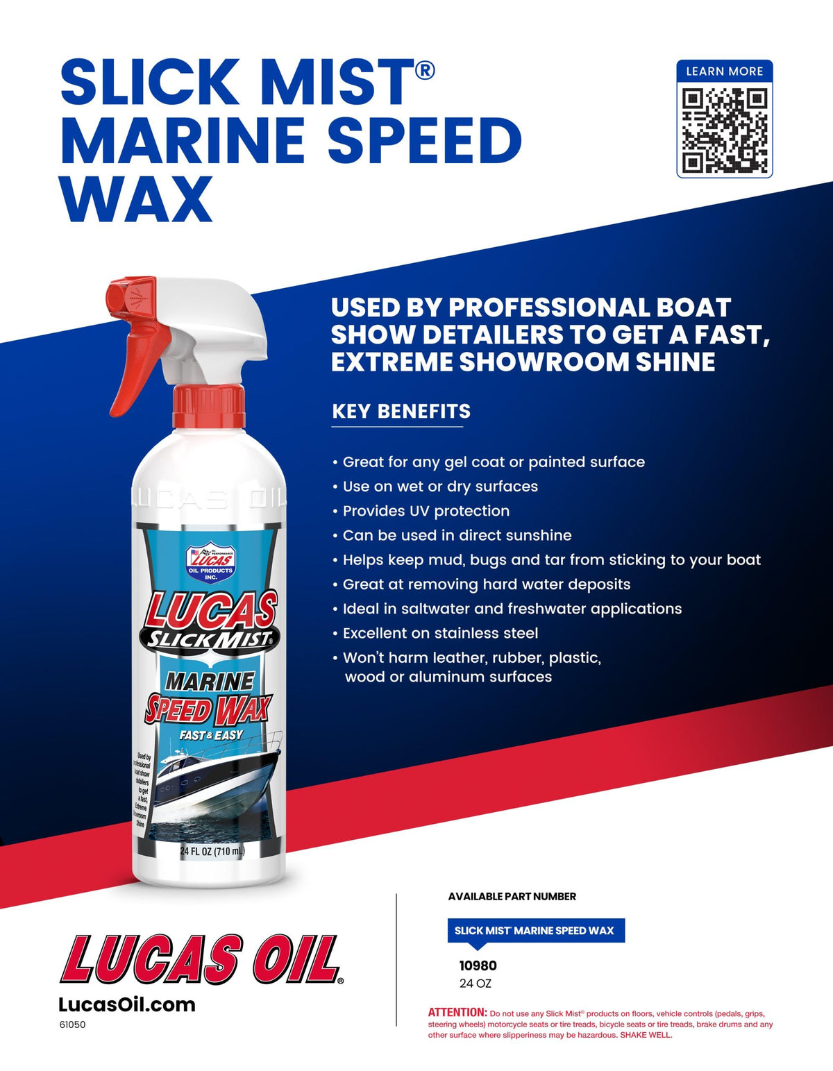 Lucas Oil Slick Mist is a polymer paint gloss intensifier, which can be used on other surfaces such as glass, chrome and vinyl decals. Use Slick Mist as a traditional wax, quick detail spray or spray it on your boat between rinsing and drying for the easiest polish job ever. Thats right! Just spray it on a wet or dry surface and wipe it off. Slick Mist out performs the competition and will leave your finish slicker and shinier than any product on the market, with long lasting protection. You and Slick Mist can give any machine an extreme gloss fast!