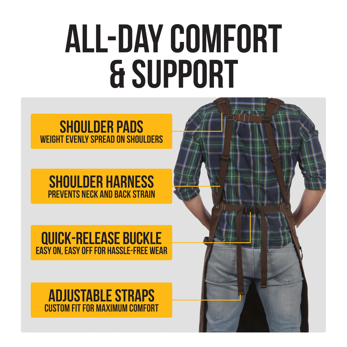 Q: How are the pockets designed in the Shop Apron?A: The Shop Apron features strategically placed pockets for convenience. It includes a large cell phone pocket (fits up to iPhone 7+) with a zip closure, two pencil pockets of differing depths, and two large front pockets with flaps to keep tools secure and free from dust.