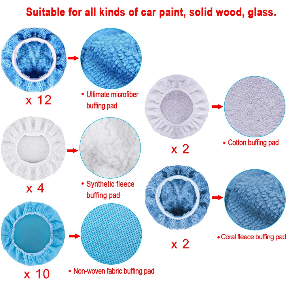 Q: How many polishing bonnets are included in the package, and what types are they?A: The package includes a total of 30 polishing bonnets: 12 microfiber car polishing bonnets, 4 waxing bonnets, 10 non-woven fabric buffing pads, 2 cotton bonnets, and 2 coral fleece bonnets, catering to various polishing needs.