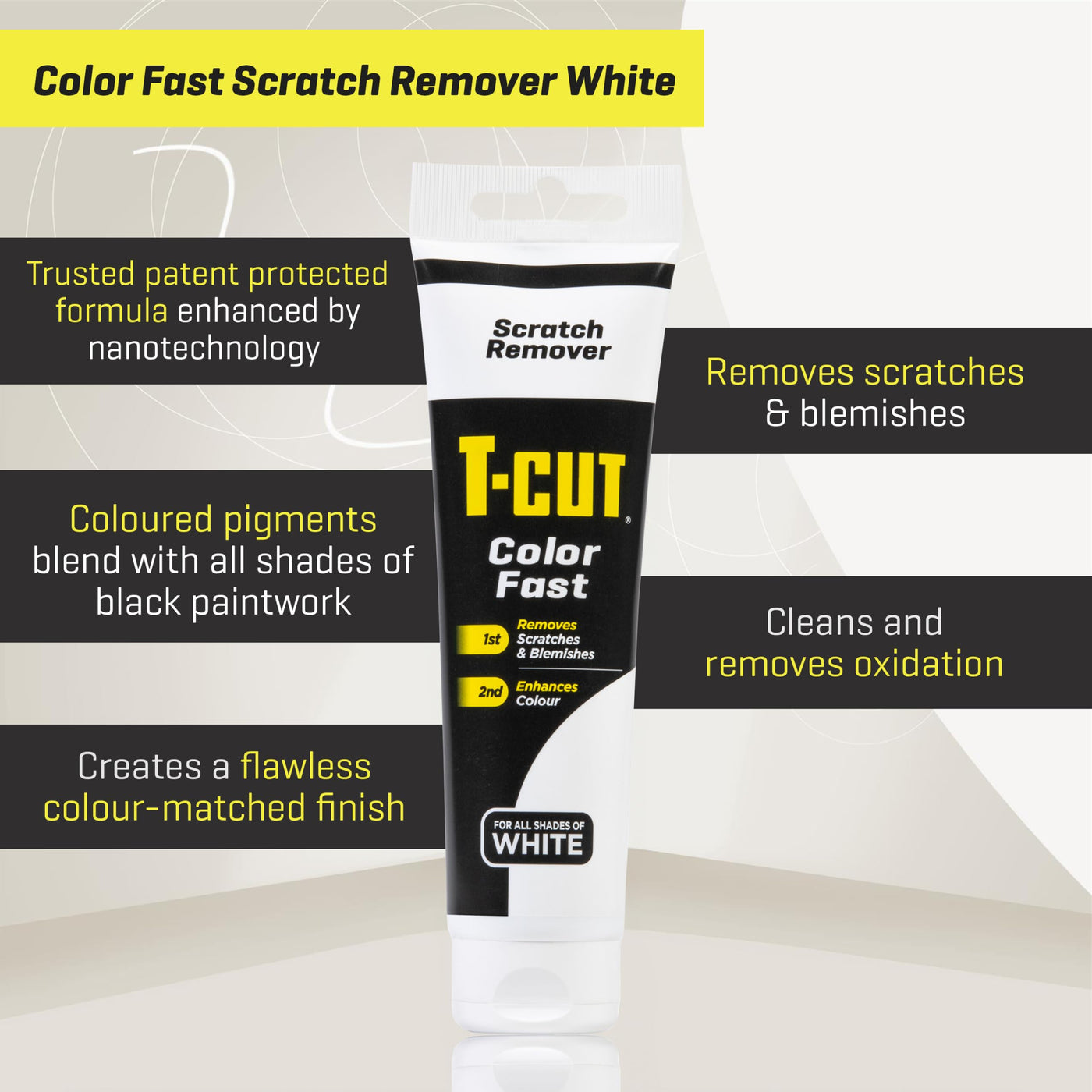 Q: What is T-Cut Color Fast White Car Wax Polish used for?A: T-Cut Color Fast White Car Wax Polish is designed to remove scratches, scuffs, and blemishes from your vehicle's paintwork while enhancing its color. The patent-pending formula not only repairs but also adds a protective layer, resulting in a flawless, color-matched finish.