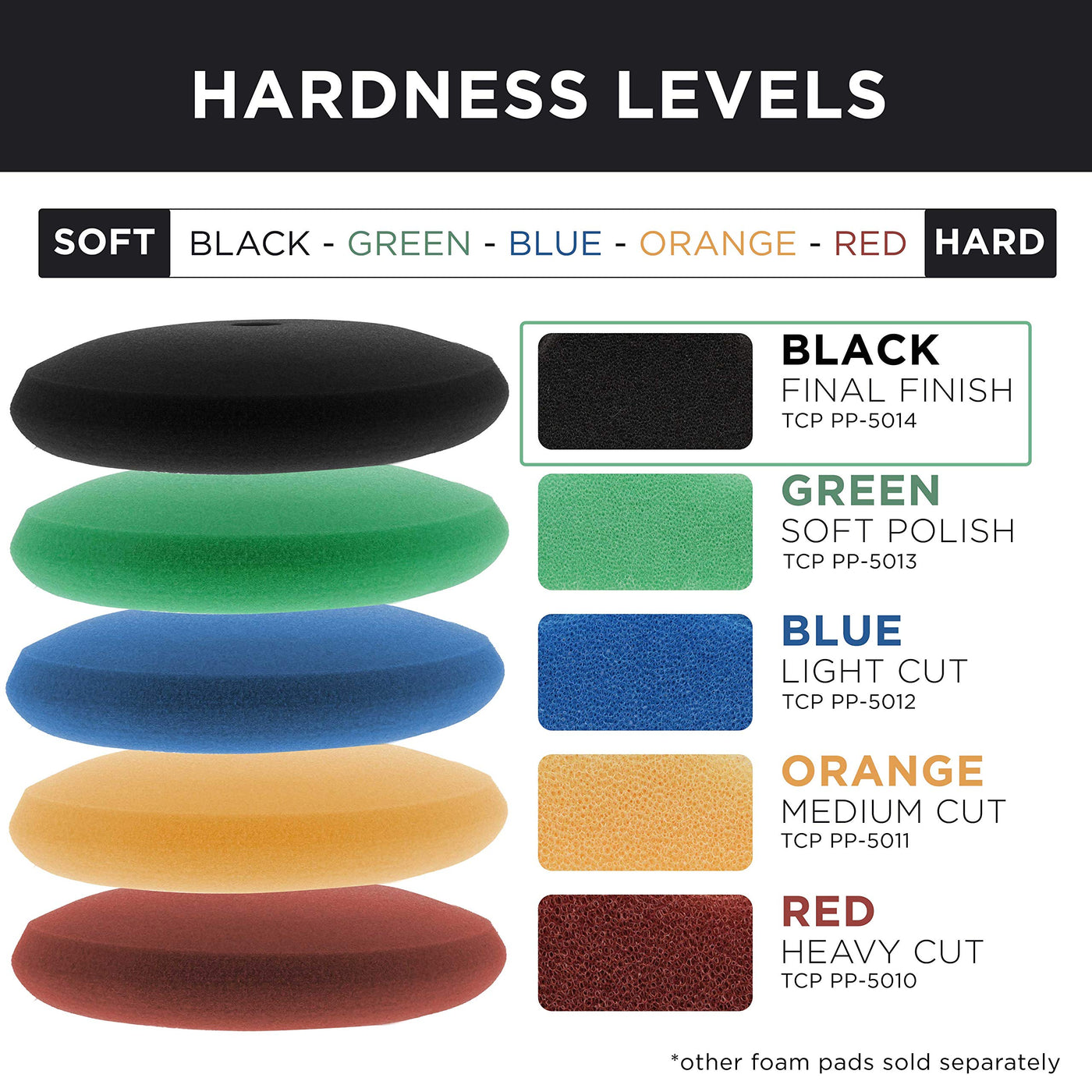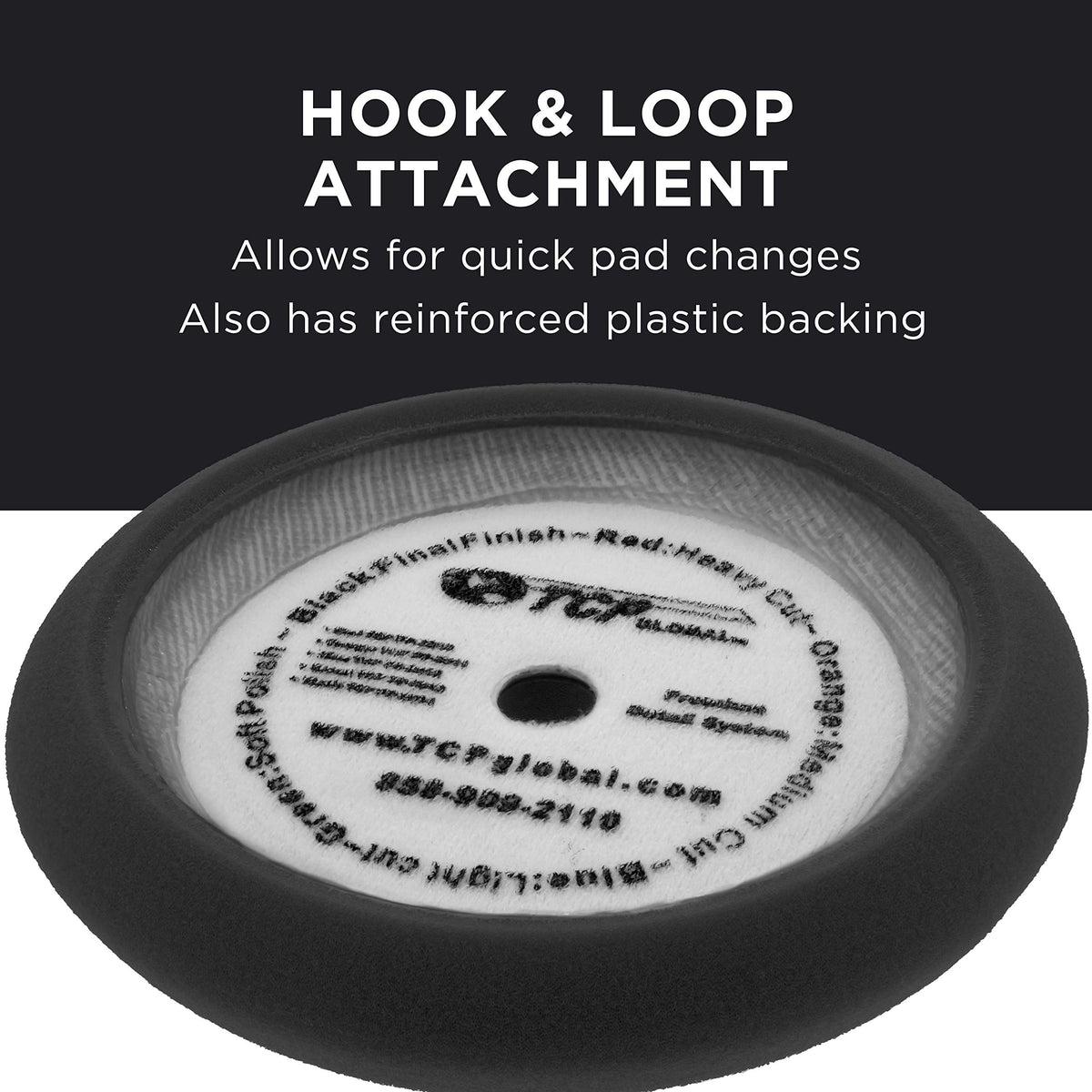 Q: What materials are used in the construction of the TCP Global foam pads?A: The TCP Global foam pads are made with durable open cell foam which improves airflow, enhancing the polishing process and ensuring effective results without cutting into the paint.