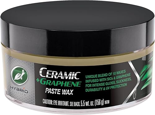 Q: What are the key benefits of using Turtle Wax 53737 Hybrid Solutions Ceramic Graphene Paste Wax?A: Turtle Wax 53737 offers incredible gloss, slickness, and long-lasting durability due to its unique formulation of 10 waxes combined with Ceramic and patent-pending Graphene technologies. It provides excellent water repellency, chemical resistance, and heat dissipation, which enhances UV protection.
