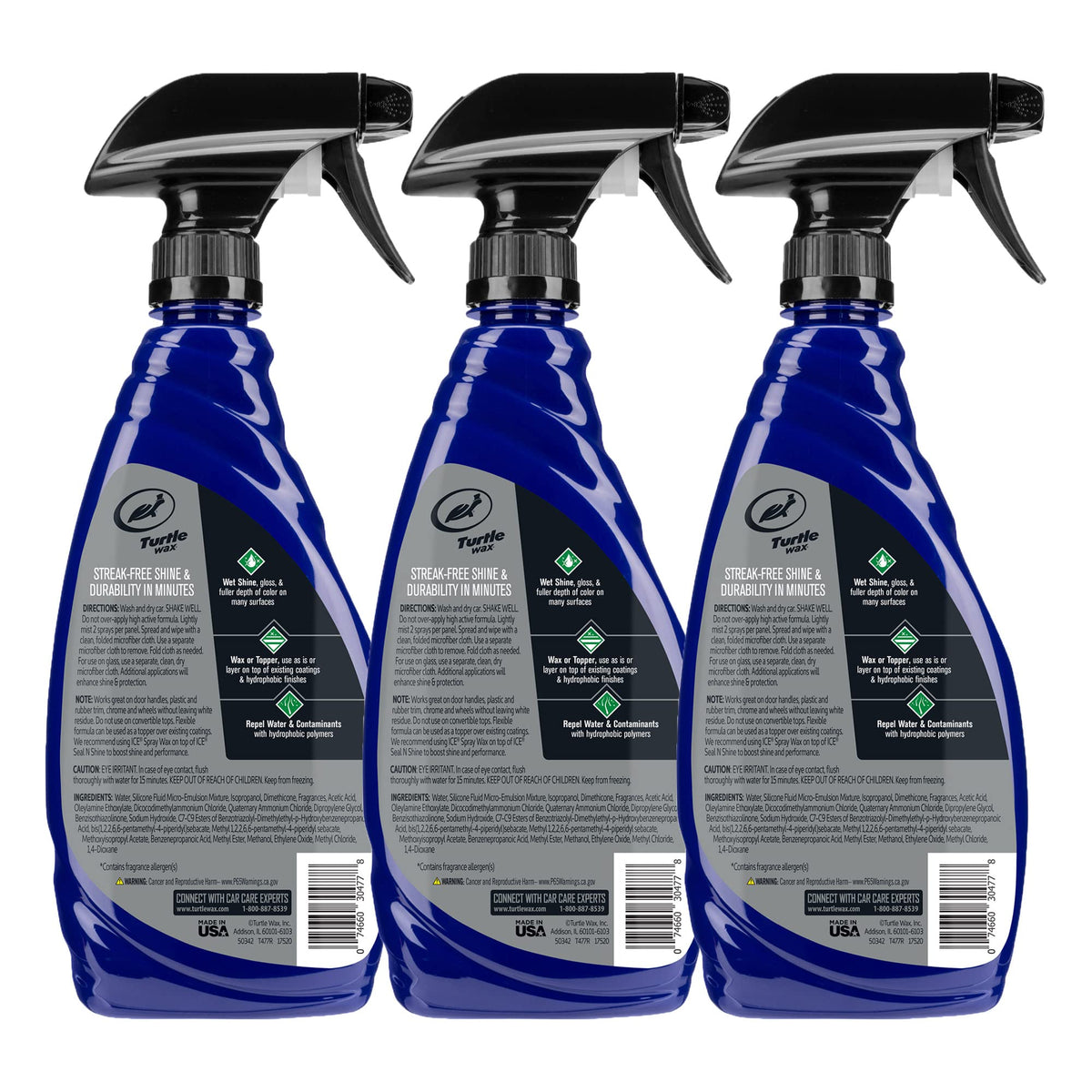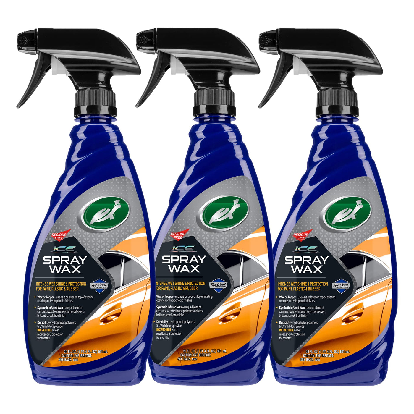 Turtle Wax ICE Spray Wax features the most advanced scientific polymer engineering to intensify and maximize car care results. Layers of interlocking synthetic polymers build an invisible barrier to provide superior weatherproof paint protection. Layers combine to magnify, intensify and maximize protection and shine. Infused with carnauba to provide months of impeccable shine and beautiful glossy finish. Ice Spray Wax features a super flexible formula, safe for use in direct sunlight and even on hot to the touch surfaces without compromising effectiveness. This premium spray wax is our recommended go-to for busy car enthusiasts in need of a quick yet powerful solution. Safe to use on all exterior surfaces including plastics, rubber trim, glass, chrome, and wheels. When used in conjunction with ICE Seal N' Shine, you can achieve the optimal level of protection that lasts for months!