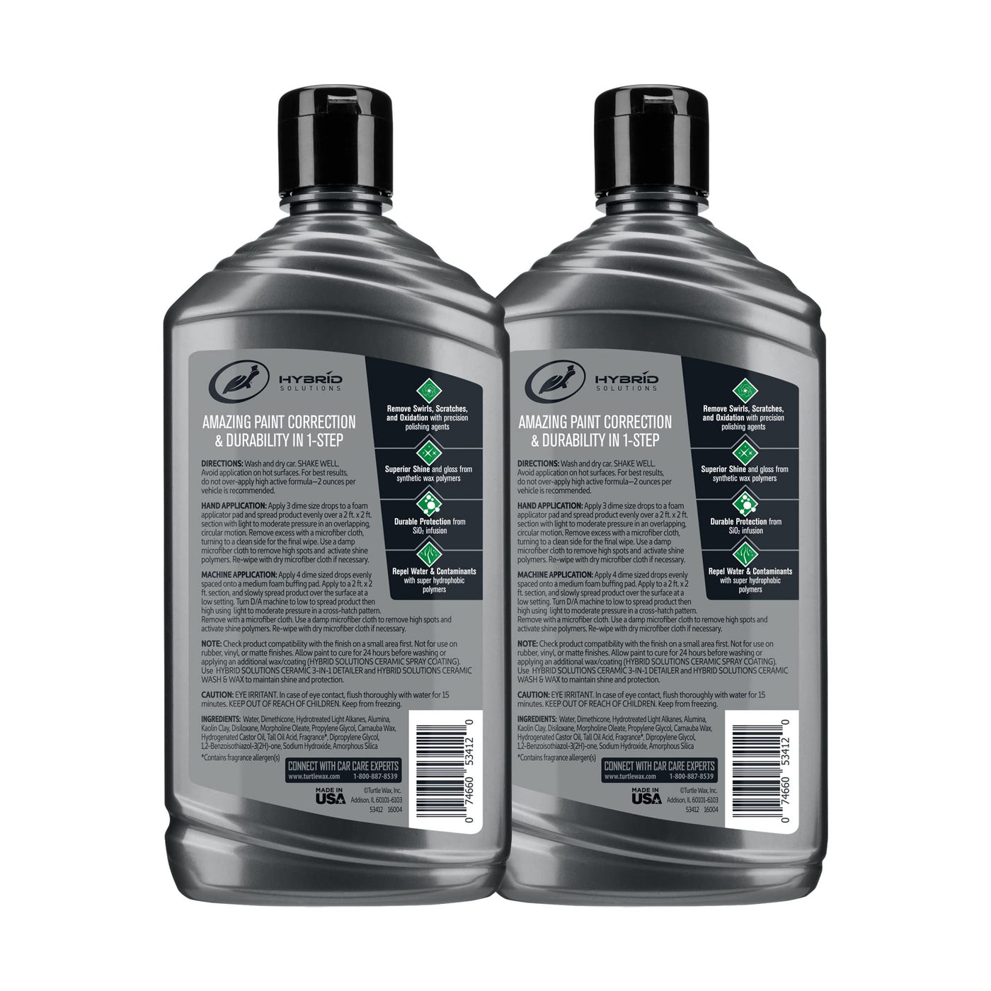 Turtle Wax Hybrid Solutions Ceramic Polish And Wax Is A Unique Time Saving Alternative To Traditional Multi-Stage Paint Correction Systems. This Product Is Ideal For Those Looking For All-In-One Paint Correction. This Innovative Technology Uses Precision Polishing Agents That Clean And Remove Paint Imperfections. Infused With Ceramic And Synthetic Waxes For Ultimate Protection Against Road Contaminants, Water, And Harsh Uv Rays Leaving A Flawless Finish With Depth Of Color, Gloss And Shine. Use This Product Either By Hand Or Machine To Remove Moderate Scratches, Oxidation And And Swirl Marks For Amazing Paint Correction And Protection In 1-Step. Not For Use On Matte Paint Finish, Plastic, Vinyl, Or Rubber. Polish Is Safe For Use On Headlights, Glass, And Metallic Paint. The Turtle Wax Hybrid Provides Professional-Grade Results, That Anyone Can Apply. With The Perfect Blend Of The Latest Technologies In Car Care, Teamed With Turtle Waxs Decades Of Experience, Hybrid Solutions Is To Deliver Unmatched Results. Not Only Will Cars Treated With Hybrid Solutions Have A High-Gloss Shine And Durable Protection For Todays Finishes, But Theyll Be Ready To Hit The Road For Any Unexpected Adventure. Turtle Wax: Dedicated To The Drive.