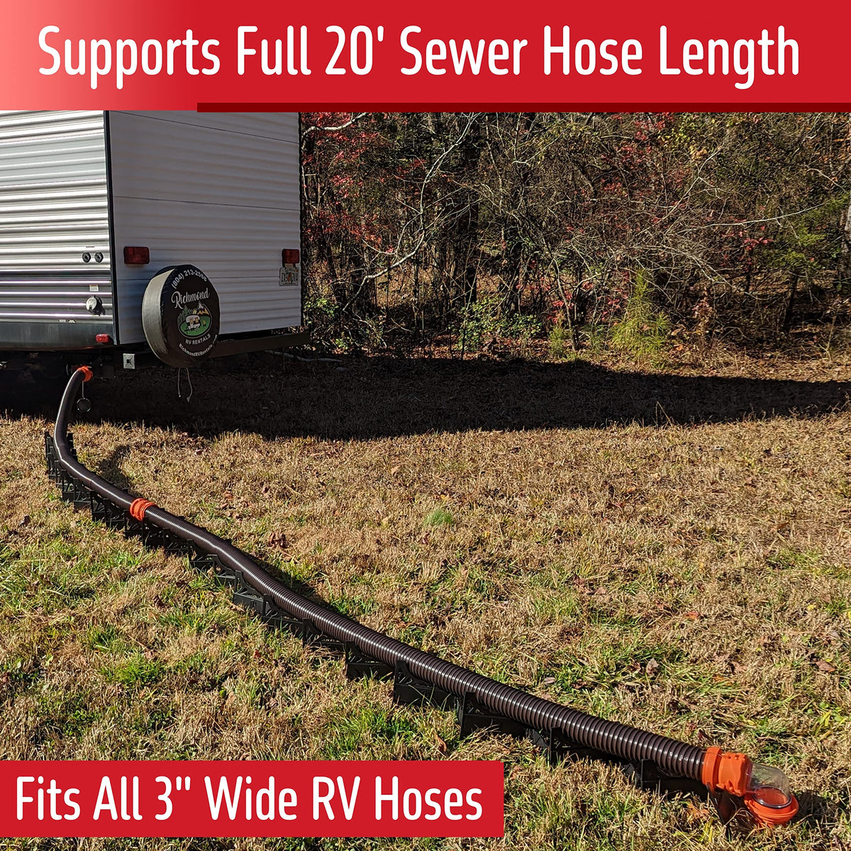 Q: Is the Beech Lane RV sewer hose support compatible with all RV sewer hoses?A: Yes, the Beech Lane sewer hose support is designed to accommodate all standard 3-inch wide RV sewer hoses, supporting a full 20-foot length for your convenience.