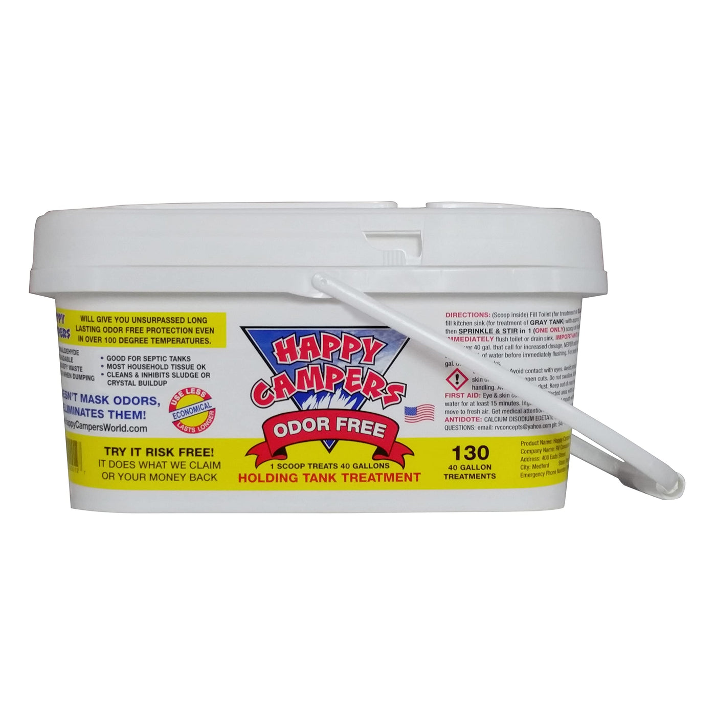 The 130 Treatment Size Happy Campers Rv Black Tank Treatment Is A Cost-Effective Industry Leader In Eliminating Odors In Camper Holding Tanks. Happy Campers Highly Concentrated Monohydrate Blend Of Minerals And Micro Nutrients Eliminate Odor At The Source, Without Covering It Up With Perfume Like Many Of The Chemical Deodorant Treatments. Happy Campers Black Tank Treatment Completely Stops Odors And Promotes The Growth Of Good Bacteria In Holding Tanks That Help Break Down Waste. Happy Campers Rv Tank Treatments Are Not Affected By Extreme Heat Or Cold And Have Enough Waste Treating Power That 1 Scoop Of Happy Camper Will Treat A 40 Gallon Black Tank Until You Dump It. If You Have Odor Coming From Your Rv Camper Black Or Gray Holding Tanks, Put Happy Campers To Work And Get Back To Enjoying Your Travels.