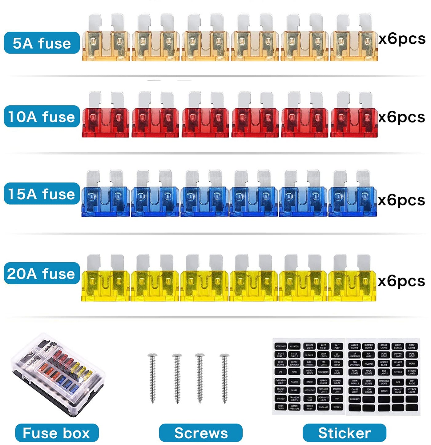 12 Volt Fuse Block, Waterproof Boat Fuse Panel with LED Warning Indicator Damp-Proof Cover - 12 Circuits with Negative Bus Fuse Box for Car Marine RV Truck DC 12-24V, Fuses Included Features: ? LED Indicator: Safe & Easy to check & replace the blown one. ? Click-lock Protective Cover:protect your fuse from dust, damp and broken. ? Labeling Stickers: easy to identify and connect the wires ? Make your wiring clean and easy Specifications ?Input: DC12-24V ?Input/Output Current: 100A max.per panel/ 30A max. per circuit ?Product Dimension: 5.4*3.3*1.4inch (138.2 * 85 * 36.5 mm) ?Material: PBT base + ABS + Copper ?Net / Gross Weight: 279 / 285g Package Included ?1*12 Way Fuse Box ?6*5A Orange Blade Fuse ?6*10A Red Blade Fuse ?6*15A Blue Blade Fuse ?6*20A Yellow Blade Fuse ?2*Sticker ?4*Screws NOTE The led indicator of the blown fuse does draw a little power so if you are extremely power-sensitive, be aware, this is the normal situation, please don't worry. Thanks for your understanding.
