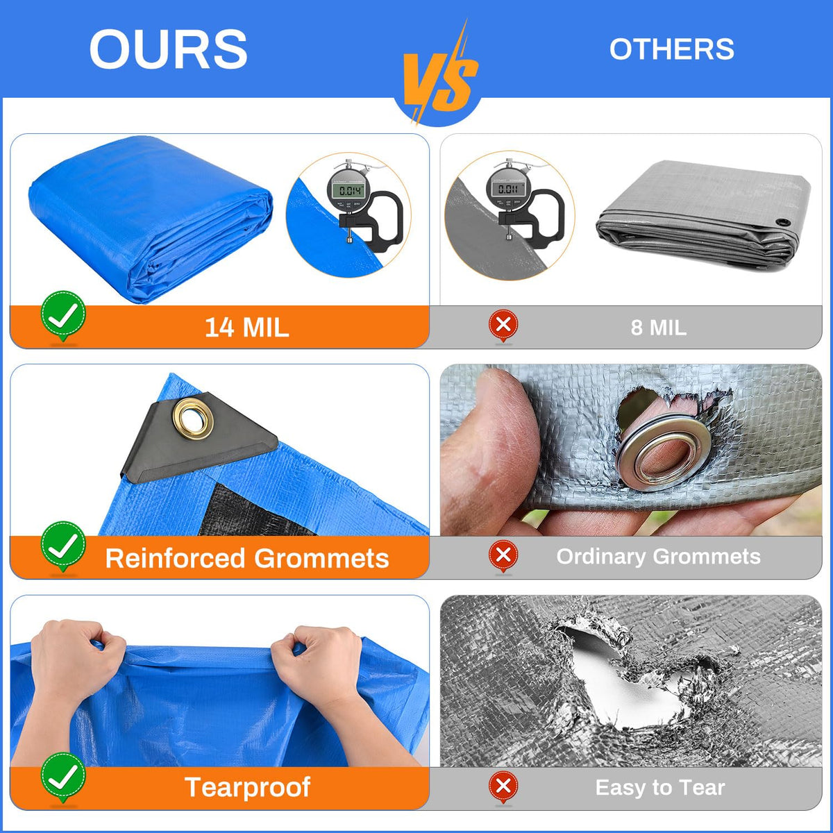 Q: What makes the Keten 12x20Ft tarp different from other tarps?A: The Keten 12x20Ft tarp is designed with a thickness of 14 mil and a 14x16 weave, offering superior durability and tear resistance. Each corner is reinforced with plastic edges to prevent tearing, and it features double hemmed and heat sealed technology for added security.