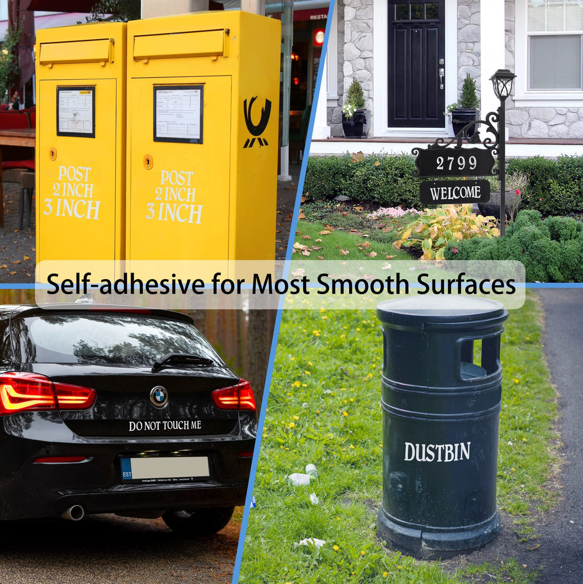 Q: What surfaces can these mailbox stickers be applied to?A: These self-adhesive mailbox numbers and letters stickers can be applied to any smooth, clean, and dry surface, making them ideal for mailboxes, doors, cars, and outdoor address posts.