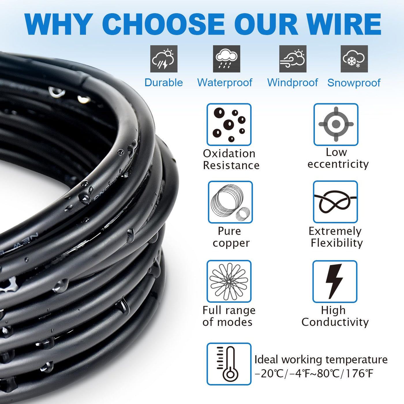 Q: Is this electrical wire suitable for outdoor use?A: Yes, this electrical wire is waterproof, dust resistant, and rated for direct burial, which makes it ideal for outdoor applications such as landscape lighting and automotive use.