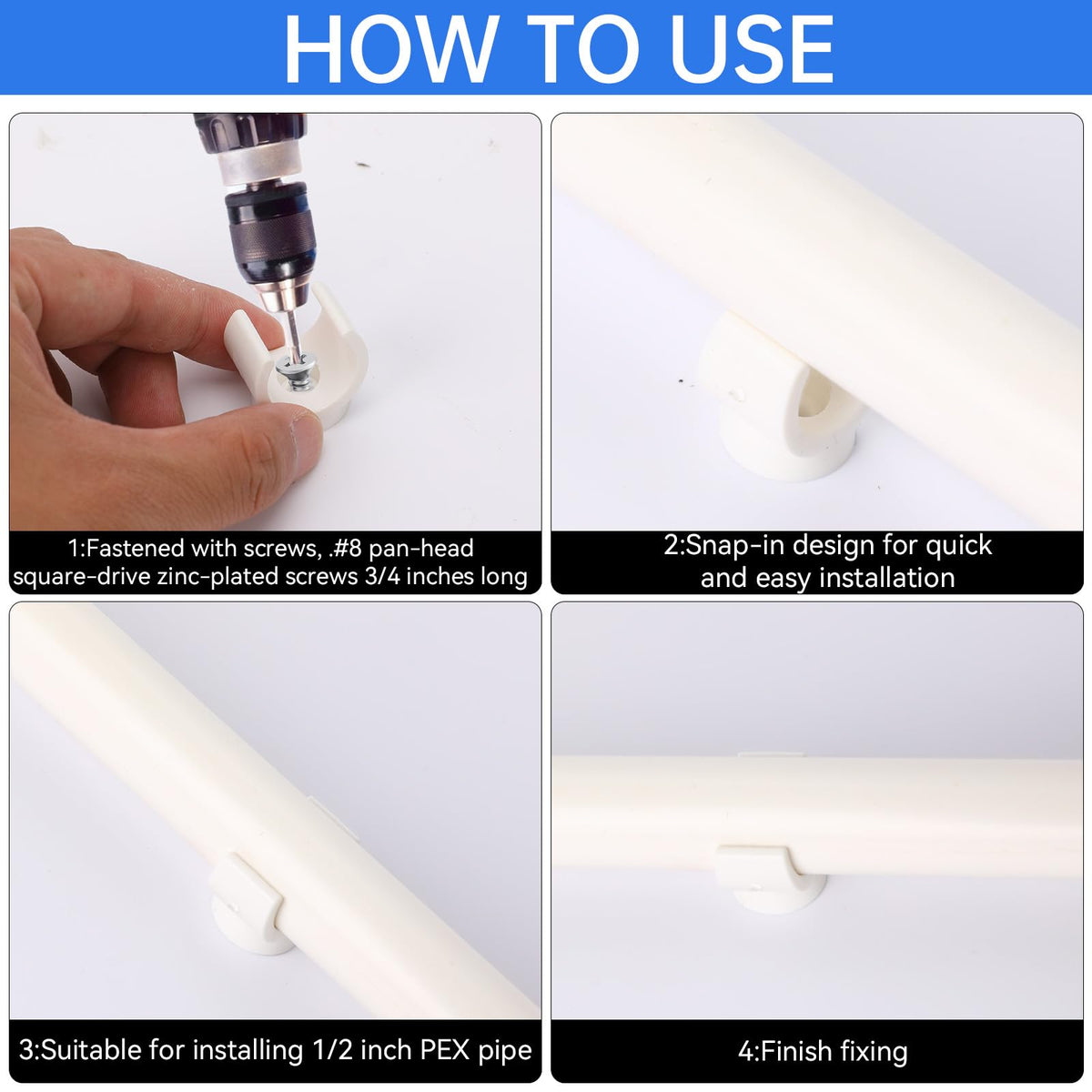 Q: How do I install the 3/4 inch pipe clamps?A: Installation is straightforward; simply fasten the clamps onto the pipes using screws. The snap-in design allows for easy and quick installation, ensuring secure support for your pipes.