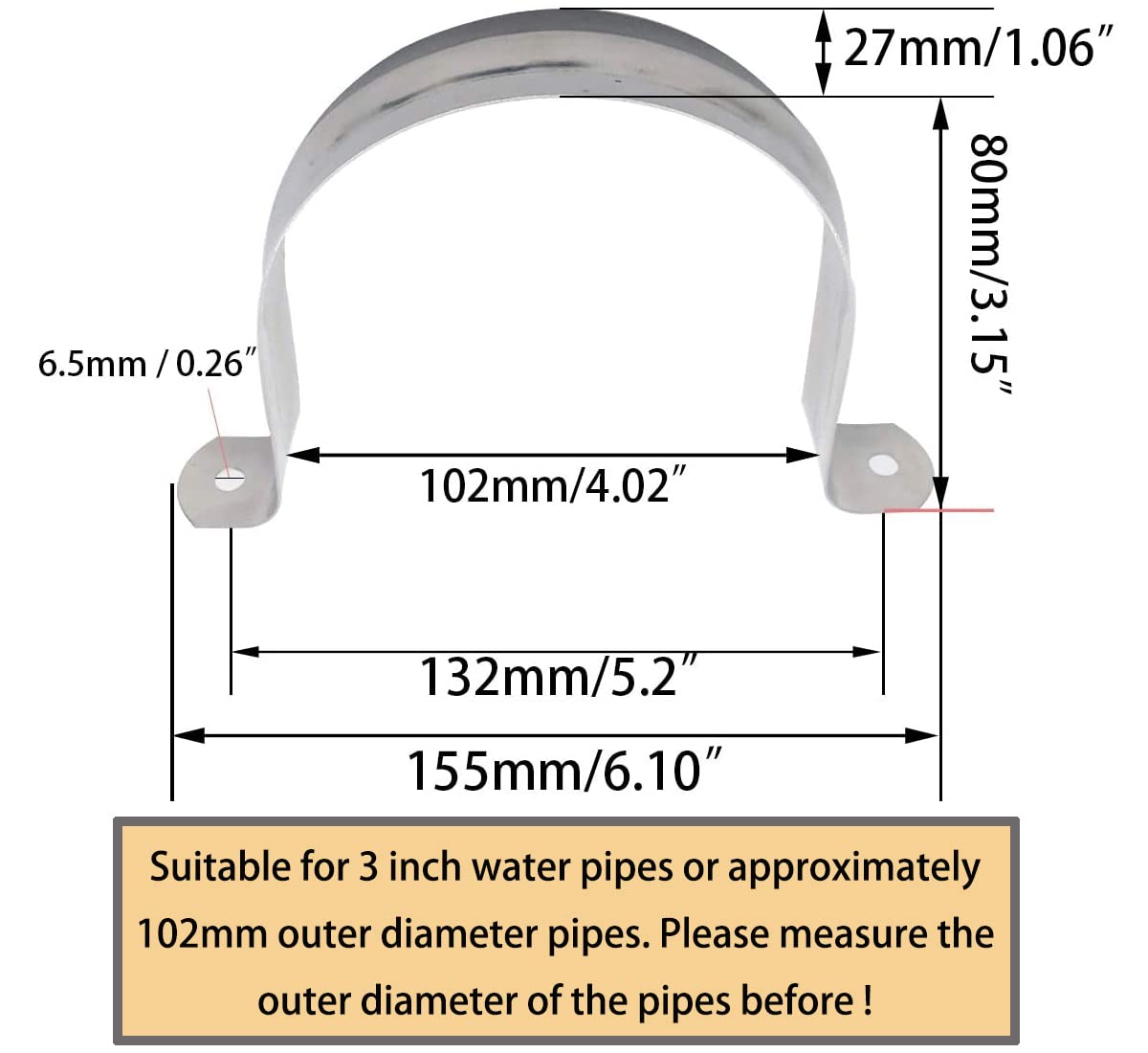 Size:95mm/3.74” Fit Pipe Diameter: 3inch Specification: Product Name: Pipe Strap Material: 304 Stainless Steel Finish: Polished Strength Grade: 6.8 Total Size:155x 30 x 80mm/ 6.10-inch x 1.18-inch x 3.15-inch (L*W*H) Mounted Hole Dia: 6.5mm/ 0.26-inch Mount Hole Center Distance: 132mm/ 5.2-inch Thickness: 0.6mm Color: Silver Tone Total package weight: 192g